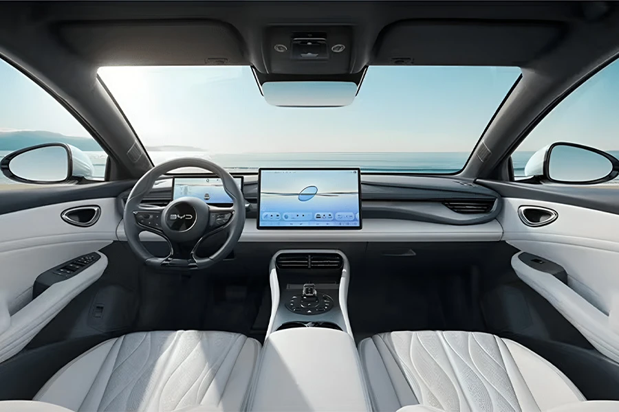 ภายในของ Seal 06 GT ถูกออกแบบให้ทันสมัยและเต็มไปด้วยเทคโนโลยี ห้องโดยสารมีสีให้เลือกระหว่างสีขาว shell white หรือสีน้ำเงิน twilight blue เราจะเห็นหน้าจอกลาง 15.6 นิ้ว มาตรวัดดิจิทัล 10.25 นิ้ว และ Head-up Display ขนาด 12 นิ้ว