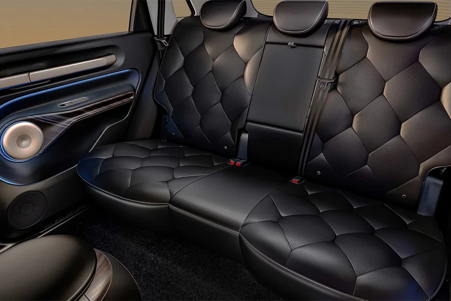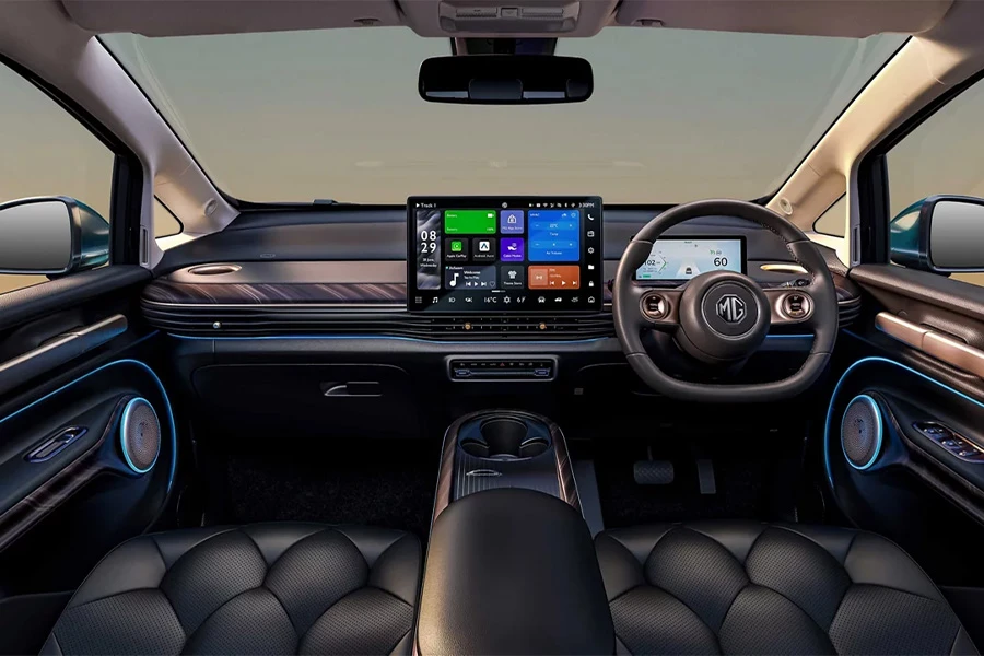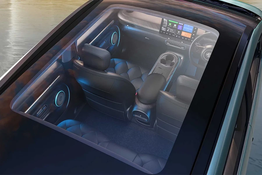 สำหรับภายในของ MG Windsor EV เต็มไปด้วยความหรูหรา ซึ่งจะเห็นได้จากการบุ soft touch หลายจุด เบาะนั่งหุ้มด้วยหนังเทียมแบบ ‘Italian Bubble-Style’ เบาะหลังมี sofa mode สามารถเอนนอนได้สูงสุด 135 องศา เบาะนั่งคู่หน้าปรับไฟฟ้า และมีหลังคาแก้วขนาดใหญ่