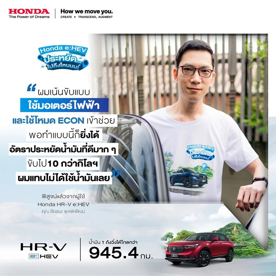 คุณชัยชนะ พูลพิพัฒน์ ลูกค้าผู้ใช้รถยนต์ ฮอนด้า เอชอาร์-วี อี:เอชอีวี กล่าวว่า “เคล็ดลับของผม คือ เน้นการขับขี่ที่ใช้มอเตอร์ไฟฟ้าเป็นหลัก โดยใช้ความเร็วที่ประมาณ 60 ถึง 70 กิโลเมตรต่อชั่วโมง ทำให้ได้อัตราการประหยัดน้ำมันที่ดี ในทางเรียบอาจจะไม่ได้มีความแตกต่างกันมาก แต่ในช่วงเวลาที่ขึ้นหรือลงเนินเขา จะต้องจับจังหวะการหน่วงให้ดี โดยช่วงขึ้นเขาอาจจะใช้โหมด ECON รวมถึงให้รถขยับช้า ๆ เพื่อให้เป็นไฟฟ้า และในจังหวะที่ลงเขาก็จะให้รถชาร์จไฟกลับ น่าจะเป็นระยะทางประมาณ 10 กว่ากิโลฯ ที่ผมแทบจะไม่ได้ใช้น้ำมันเลย ทำให้ได้ตัวเลขอัตราการประหยัดน้ำมันที่ดีมาก”