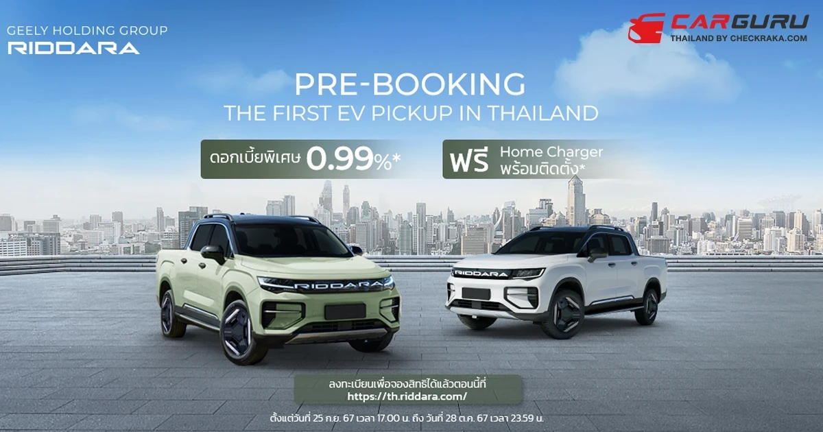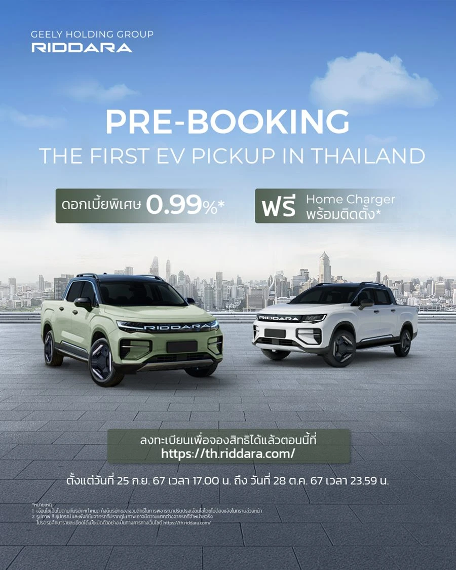 RIDDARA แบรนด์รถกระบะพลังงานไฟฟ้าในเครือ GEELY จัดแคมเปญ RIDDARA PRE-BOOKING เปิดให้จองสิทธิเป็นเจ้าของ RIDDARA ก่อนใคร จองวันนี้รับข้อเสนอสุดพิเศษทั้งดอกเบี้ย 0.99%* และรับฟรี Home Charger พร้อมค่าบริการติดตั้ง* สำหรับลูกค้า 1,000 ท่านแรกเท่านั้น ผู้ที่สนใจสามารถจองสิทธิได้ผ่านเว็บไซต์ https://th.riddara.com ตั้งแต่วันที่ 25 กันยายน 2567 ถึงวันที่ 28 ตุลาคม 2567 นี้
