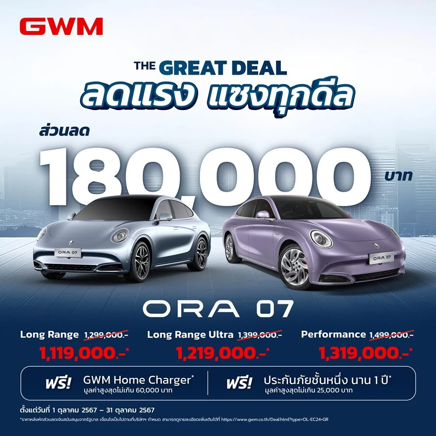 - GWM ORA 07 รุ่น LONG RANGE จากราคา 1,299,000 บาท เหลือเพียง 1,119,000 บาท