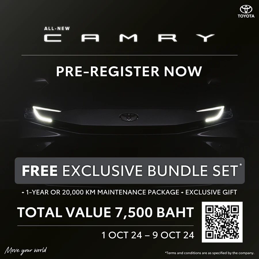บริษัท โตโยต้า มอเตอร์ ประเทศไทย จำกัด เปิดรับลงทะเบียนจองสิทธิ์ก่อนการเปิดตัวอย่างเป็นทางการ สำหรับผู้ที่สนใจเป็นเจ้าของซีดานขนาดกลางระดับหรู รุ่นใหม่ล่าสุดจากโตโยต้า กับกิจกรรม ALL-NEW CAMRY Exclusive Pre-register โดยสามารถลงทะเบียนผ่านช่องทางออนไลน์ที่ www.toyota.co.th/promotion/exclusivepreregister/camry หรือติดต่อโชว์รูมผู้แทนจำหน่ายโตโยต้า ตั้งแต่วันที่ 1 - 9 ตุลาคม พ.ศ. 2567 สำหรับผู้ที่ทำการจองรถภายในวันที่ 31 ตุลาคม และรับรถภายใน 31 ธันวาคม พ.ศ. 2567 ยังจะได้รับ Exclusive Bundle Set มูลค่า 7,500 บาท ได้แก่ ฟรี เช็กระยะ 1 ปี หรือ 20,000 กม.* และของสมนาคุณพิเศษ** สิทธิพิเศษสุด Exclusive เฉพาะสำหรับลูกค้าโตโยต้า ALL-NEW CAMRY เท่านั้น