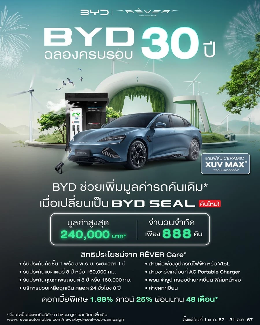 บีวายดี บริษัทเทคโนโลยีชั้นนำที่มุ่งมั่นสร้างนวัตกรรมเพื่อยกระดับคุณภาพชีวิต และ บริษัท เรเว่ ออโตโมทีฟ จำกัด ผู้จัดจําหน่ายและให้บริการหลังการขายรถยนต์พลังงานไฟฟ้าบีวายดีอย่างเป็นทางการในประเทศไทย ภายใต้กลุ่มธุรกิจเรเว่ ในโอกาสที่สาธารณรัฐประชาชนจีนครบรอบ 75 ปีแห่งการก่อตั้ง ขอส่งความยินดีเนื่องในโอกาสที่บริษัท BYD กำลังจะครบรอบ 30 ปี และพร้อมที่จะก้าวสู่ทศวรรษใหม่ด้วยความมุ่งมั่น เตรียมก้าวสู่ทศวรรษใหม่อย่างเต็มภูมิด้วยความมุ่งมั่นที่จะสานต่อความร่วมมือทางธุรกิจอย่างรอบด้านระหว่างสองบริษัท ควบคู่ไปกับการขับเคลื่อนอุตสาหกรรมยานยนต์ไฟฟ้าเพื่อเปลี่ยนผ่านประเทศไทยสู่ยุคพลังงานใหม่ โดยในโอกาสนี้ บีวายดี และ เรเว่ ออโตโมทีฟ ได้จัดแคมเปญสุดพิเศษแทนคำขอบคุณลูกค้าชาวไทย ช่วยเพิ่มมูลค่ารถคันเดิม เมื่อเปลี่ยนเป็น BYD SEAL คันใหม่ มูลค่าสูงสุด 240,000 บาท จำนวนจำกัดเพียง 888 คัน ตั้งแต่วันที่ 1 - 30 ตุลาคม 2567