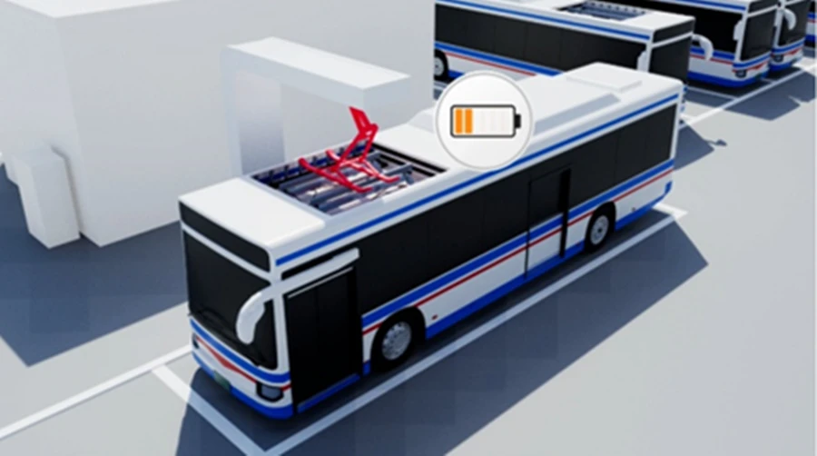 ภาพรถบัสไฟฟ้าที่ติดตั้งแบตเตอรี่ SCiB™ ของโตชิบา ซึ่งชาร์จด้วยระบบแหนบรับไฟ หรือแพนโทกราฟ