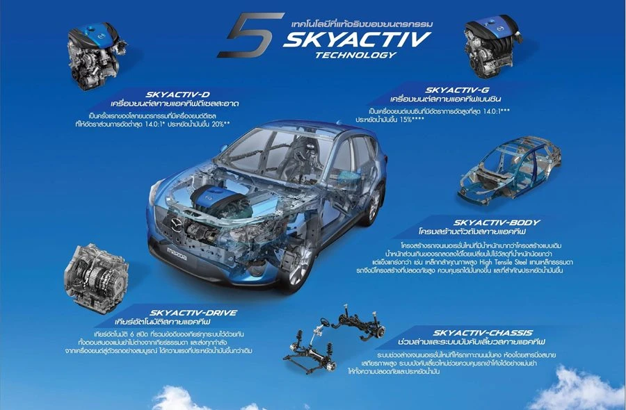 นอกจากองค์ประกอบที่สำคัญของเทคโนโลยีสกายแอคทีฟแล้ว ยังรวมถึงระบบความปลอดภัยระดับโลก ด้วยโครงสร้างตัวถังสกายแอคทีฟที่มีน้ำหนักเบาแต่ความแข็งแรงสูงและทนต่อแรงบิดมากขึ้น ให้ความปลอดภัยขั้นสูงสุดหากเกิดการชนปะทะ ระบบช่วงล่างและระบบบังคับเลี้ยวสกายแอคทีฟ แน่นหนึบทุกการเข้าโค้ง และเกียร์อัตโนมัติสกายแอคทีฟ 6 สปีด เป็นต้น องค์ประกอบที่สมบูรณ์แบบเหล่านี้ คือองค์ประกอบสำคัญที่ส่งผลทำให้รถยนต์รุ่นนี้ได้รับการยอมรับอย่างแพร่หลายในกลุ่มผู้ใช้งานอย่างแท้จริง
