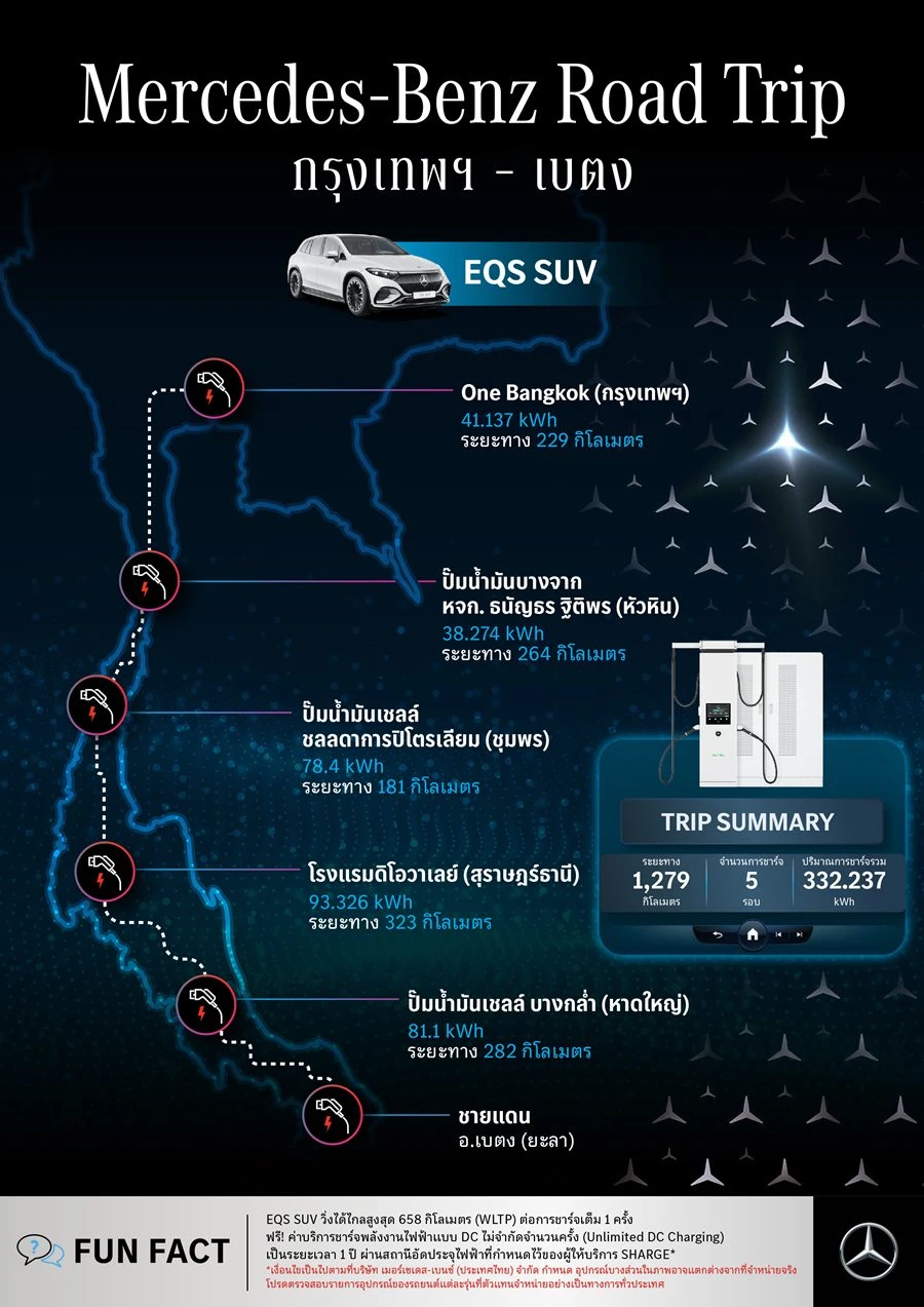 ตลอดการเดินทางจากกรุงเทพฯ สู่เบตง จ.ยะลา รวมระยะทางกว่า 1,279 กิโลเมตร ไม่เพียงแค่การไปถึงจุดหมายปลายทางเท่านั้น แต่เป็นการเปิดประสบการณ์ใหม่ในทุกกิโลเมตร โดย EQS 450 4MATIC SUV AMG Dynamic ได้แสดงให้เห็นสมรรถนะอันยอดเยี่ยม ด้วยความสามารถในการขับขี่ได้ไกลสูงสุด 658 กิโลเมตร (WLTP) ต่อการชาร์จเต็ม 1 ครั้ง ทำให้การเดินทางในครั้งนี้เต็มไปด้วยประสบการณ์ในทุกมิติ ตั้งแต่การขับขี่บนถนนหลายสายที่แตกต่างกัน การเบรกและการเร่งความเร็วเพื่อสัมผัสอิสระบนท้องถนน ไปจนถึงการเพลิดเพลินกับธรรมชาติที่สวยงามสองข้างทางของภาคใต้