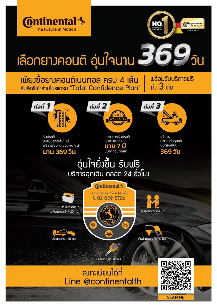 ยางคอนติเนนทอล มอบระยะเวลาประกันนาน 369 วัน พร้อมข้อเสนอพิเศษฟรี 3 ต่อ อุ่นใจ คลายกังวล ทุกเส้นทาง