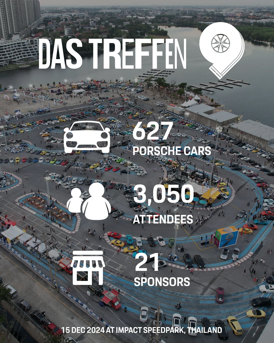 สนามอิมแพ็ค สปีด พาร์ค (IMPACT Speedpark) ที่เมืองทองธานี กรุงเทพมหานคร ได้ต้อนรับผู้ที่ชื่นชอบปอร์เช่ (Porsche) มากกว่า 3,050 คนจากทั่วภูมิภาคสำหรับงาน ดาส เทรฟเฟน (Das Treffen) ครั้งที่ 9 การรวมพลที่ใหญ่ที่สุดของเหล่าคนรักปอร์เช่ (Porsche) ในเอเชียตะวันออกเฉียงใต้ ปีนี้ รังสรรค์ภายใต้ธีม ลิมิเต็ด อิดิชั่น (Limited Edition) ได้จัดแสดงรถสปอร์ตปอร์เช่ (Porsche) รุ่นหายากทั้งคลาสสิก จนถึงรุ่นใหม่ล่าสุดอย่างน่าทึ่ง นอกจากนี้ยังมีการนำเสนอ ไทคานน์ เทอร์โบ เอส เซเลสเชี่ยล เจด (Taycan Turbo S Celestial Jade) รุ่นพิเศษที่ผลิตเพียงคันเดียวในโลก ซึ่งแสดงให้เห็นถึงฝีมือการออกแบบของแผนก Sonderwunsch พร้อมทั้งสะท้อนถึงมรดกอันหลากหลายและจิตวิญญาณแห่งอนาคตของภูมิภาคเอเชียตะวันออกเฉียงใต้