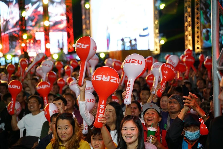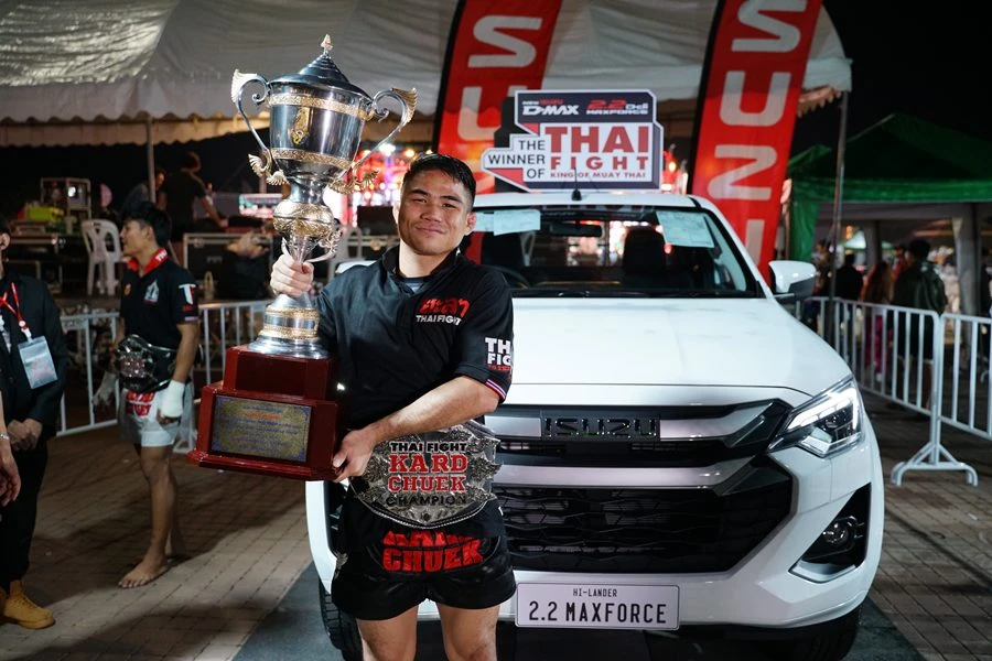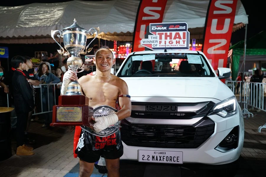 มร. ทาคาชิ ฮาตะ กรรมการผู้จัดการ บริษัท ตรีเพชรอีซูซุเซลส์ จำกัด แสดงความยินดีกับ 3 สุดยอดนักชกไทยผู้คว้าแชมป์ THAI FIGHT 2024 รอบชิงชนะเลิศในงาน THAI FIGHT พะเยา ได้ครองถ้วยพระราชทานในพระบาทสมเด็จพระเจ้าอยู่หัว และได้รับรางวัลชนะเลิศรถปิกอัพรุ่นใหม่ล่าสุด ใหม่! อีซูซุ