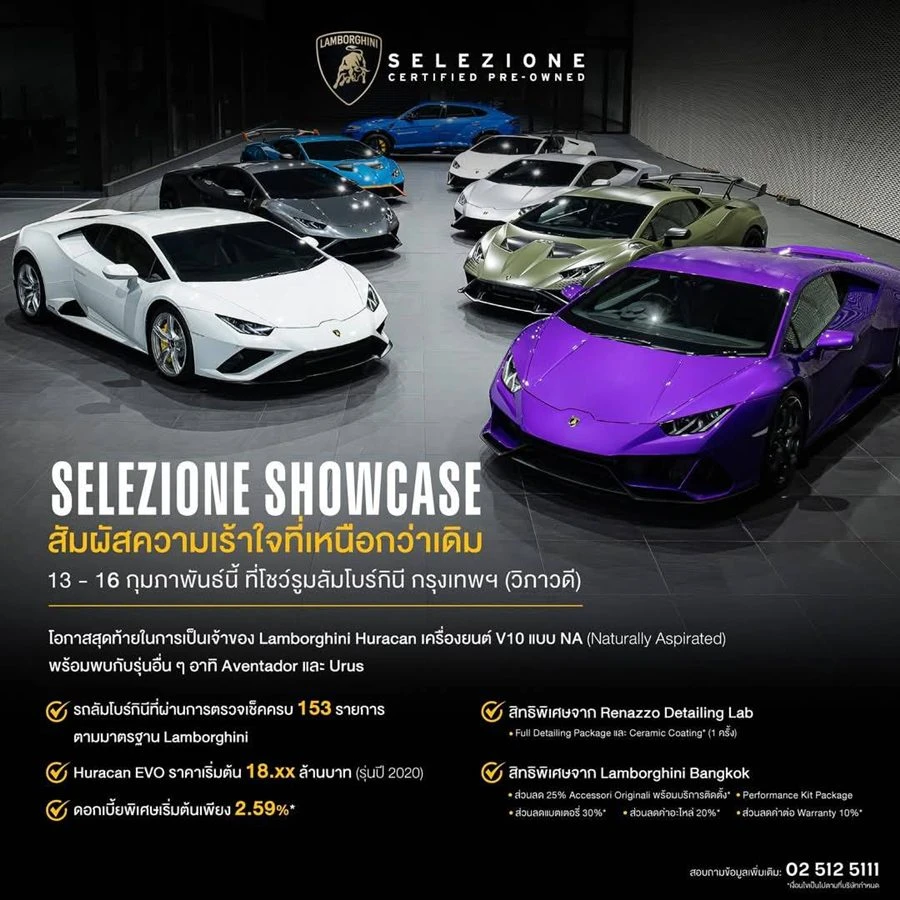 ร่วมสัมผัสประสบการณ์สุดพิเศษจากซูเปอร์สปอร์ตคาร์ได้ที่ ลัมโบร์กินี กรุงเทพฯ โชว์รูมและศูนย์บริการครบวงจรขนาดใหญ่ที่สุดในเอเชียแปซิฟิก ถนนวิภาวดีรังสิต สอบถามรายละเอียดเพิ่มเติมได้ที่ 02-512-5111