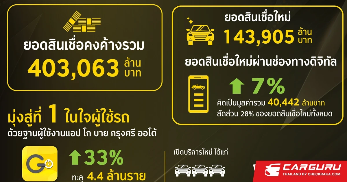 กรุงศรี ออโต้ ผู้นำธุรกิจสินเชื่อยานยนต์ครบวงจร เครือธนาคารกรุงศรีอยุธยา จำกัด (มหาชน) ประกาศผลการดำเนินงานปี 2567 ดันยอดสินเชื่อใหม่ผ่านช่องทางดิจิทัลโต 7% หรือประมาณ 40,442 ล้านบาท พร้อมขยายฐานผู้ใช้รถบน แอป โก บาย กรุงศรี ออโต้ ทะลุ 4.4 ล้านคน และผลักดันอีโคซิสเต็มเพื่อผู้ใช้รถให้สมบูรณ์แบบ รวมถึงต่อยอดโอกาสทางธุรกิจ ด้วยการพัฒนาบริการ GO Auto Station ตลาดรถยนต์มือสองคุณภาพดี PromptBuy ศูนย์รวมสินค้ารักษ์โลกเพื่อไลฟ์สไตล์ที่ยั่งยืน และฟีเจอร์ GO Travel บัดดี้ท่องเที่ยวคู่ใจผู้ใช้รถ เพื่อมุ่งสู่การเป็นที่ 1 ในใจผู้ใช้รถ ควบคู่ไปกับการดำเนินธุรกิจให้เติบโตอย่างยั่งยืน