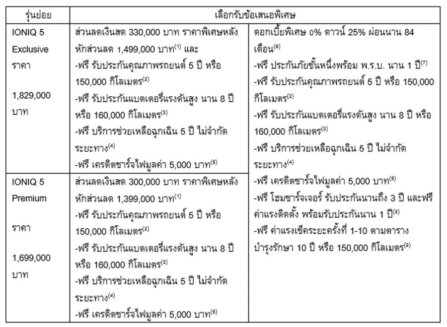 (1) ส่วนลดเงินสดมูลค่า 300,000 บาท สำหรับ IONIQ5 รุ่นย่อย Premium ราคา 1,699,000 บาท ราคาพิเศษเริ่มต้น 1,399,000 บาท และ ส่วนลดเงินสดมูลค่า 330,000 บาท สำหรับ รุ่นย่อย Exclusive ราคา 1,829,000 บาท ราคาพิเศษเริ่มต้น 1,499,000 บาท