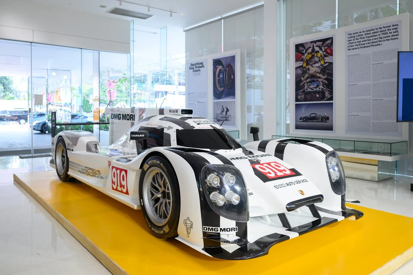 อีกหนึ่งไฮไลต์สำคัญของนิทรรศการคือ ปอร์เช่ 919 ไฮบริด (Porsche 919 Hybrid) ตำนานรถแข่งไฮบริดที่สร้างชื่อให้ปอร์เช่ในยุคของยนตรกรรมพลังงานไฟฟ้า รถแข่งคันนี้คว้าชัยชนะ 24 Hours of Le Mans การแข่งขันในสนามเอนดูรานซ์ระดับโลก ถึง 3 ปีซ้อน ในปี 2015, 2016 และ 2017 ถือเป็นสัญลักษณ์แห่งความสำเร็จสูงสุดของปอร์เช่ในสนามแข่งระดับโลก ในเวอร์ชัน "919 Evo" ซึ่งถูกปลดล็อกข้อจำกัดด้านกฎการแข่งขัน รถคันนี้ได้สร้างสถิติเวลาต่อรอบ 5:19.55 นาที บนสนามแข่งระดับตำนาน Nürburgring Nordschleife โดยมี ทิโม่ แบร์นฮาร์ด (Timo Bernhard) นักขับโรงงานของปอร์เช่เป็นผู้ควบคุมพวงมาลัย ซึ่งสถิตินี้ยังคงไร้ผู้โค่นล้มมาจนถึงปัจจุบัน
