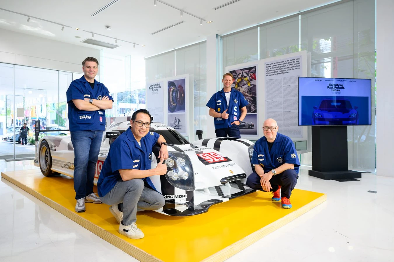 นิทรรศการครั้งนี้สะท้อน จิตวิญญาณแห่งการบุกเบิกของปอร์เช่ โดยย้อนกลับไปสู่จุดเริ่มต้นในปี 1900 เมื่อ เฟอร์ดินานด์ ปอร์เช่ (Ferdinand Porsche) ได้สร้างสรรค์ Lohner-Porsche System ซึ่งถือเป็นมอเตอร์ไฟฟ้าที่ติดตั้งบริเวณดุมล้อคันแรกของโลก และนำเสนอสิ่งประดิษฐ์อันล้ำหน้านี้ต่อสาธารณชนเป็นครั้งแรก ณ งาน Paris Exposition ภายใน Palace of Electricity กว่า 100 ปีต่อมา ปอร์เช่ยังคงเป็นผู้นำในโลกของยนตรกรรมสปอร์ตพลังงานไฟฟ้า และหนึ่งในไฮไลต์สำคัญของนิทรรศการ Electrifying Past. Present. Future.