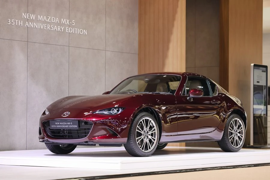 ไม่เพียงเท่านี้ มาสด้ายังได้นำยนตรกรรมรุ่นใหม่ล่าสุด แบรนด์ไอคอนยอดนิยม New Mazda MX-5 35th Anniversary Edition มาจัดแสดงให้แฟน ๆ ในประเทศไทยได้ชมและครอบครองเป็นเจ้าของ มาพร้อมการตกแต่งพิเศษเพื่อถ่ายทอดความพิเศษในทุกองค์ประกอบ ไม่ว่าจะเป็น สีภายนอกพิเศษ Artisan Red Premium สัญลักษณ์รุ่นพิเศษ 35th Anniversary Edition พนักพิงศีรษะ และพรม พร้อม Serial Number ที่บริเวณด้านข้างตัวถัง เพื่อบ่งบอกถึงบอกถึงความพิเศษในฐานะรุ่นลิมิเต็ด รวมถึงเบาะหนังสีพิเศษ Sports Tan หลังคาแข็งเปิด-ปิดด้วยระบบไฟฟ้า กระจกมองข้างสีเดียวกับตัวรถ พร้อมล้ออัลลอยขนาด 17 นิ้ว สี Bright วางจำหน่ายในจำนวนจำกัด ในราคา 3,069,000 บาท