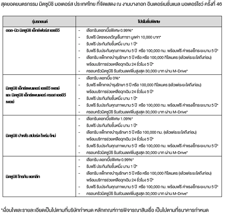 ผู้สนใจสามารถชมรถยนต์ มิตซูบิชิ ทุกรุ่นได้ที่บูธมิตซูบิชิ มอเตอร์ส ประเทศไทย (A9) ที่งานบางกอก อินเตอร์เนชั่นแนล มอเตอร์โชว์ ครั้งที่ 46 หรือ Bangkok International Motor Show 2025 ณ อิมแพค ชาเลนเจอร์ 1 - 3 เมืองทองธานี สอบถามข้อมูลเพิ่มเติม และนัดหมายเพื่อทดลองขับได้ที่ www.mitsubishi-motors.co.th หรือ มิตซูบิชิ คอลเซ็นเตอร์ หมายเลขโทรศัพท์ 02-079-9500 เปิดรับสายทุกวัน ตลอด 24 ชั่วโมง
