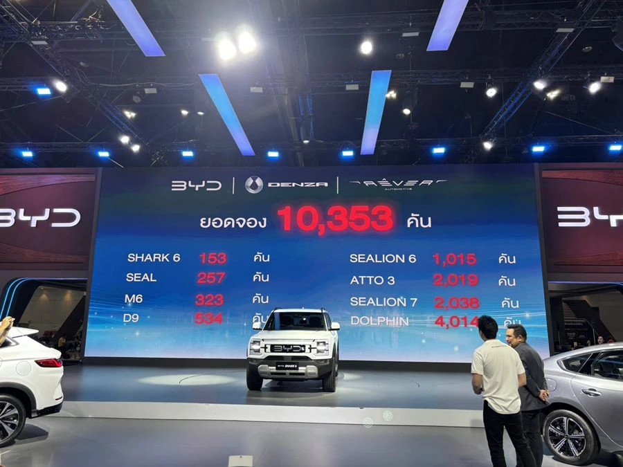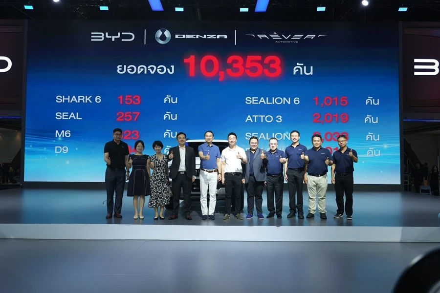 บริษัท เรเว่ ออโตโมทีฟ จำกัด ผู้จัดจําหน่ายและให้บริการหลังการขาย รถยนต์พลังงานไฟฟ้า BYD และ DENZA อย่างเป็นทางการในประเทศไทย ขอขอบคุณทุกความเชื่อใจที่ได้รับจากผู้บริโภค หลังให้ความไว้วางใจสั่งซื้อรถยนต์ BYD และ DENZA ในงาน บางกอก อินเตอร์เนชั่นแนล มอเตอร์โชว์ ครั้งที่ 46 โดยมียอดรวมทั้งสิ้นกว่า 10,353 คัน ซึ่งยอดดังกล่าวรวมถึง BYD SHARK 6 DMO รถกระบะมาดแกร่ง ขับเคลื่อนด้วยขุมพลัง PHEV แบบ DMO ซึ่งเปิดรับคำสั่งซื้อเป็นครั้งแรกของประเทศไทยที่งานนี้ โดยในวันสรุปยอดจองมีผู้บริหารร่วมแถลงความสำเร็จดังนี้