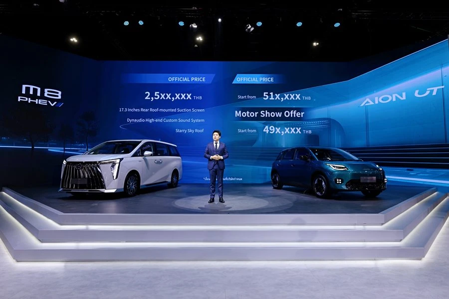 ได้แก่ AION UT รถยนต์ไฟฟ้าสไตล์แฮทช์แบคที่มาพร้อมเทคโนโลยีล้ำสมัย และ M8 PHEV รถยนต์ MPV ระดับพรีเมียมที่ขับเคลื่อนด้วยระบบ Plug-in Hybrid ให้ความสะดวกสบายและความหรูหราที่เหนือระดับและตอบโจทย์การใช้งานจริงอย่างครอบคลุม