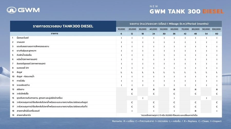 สำหรับ NEW GWM TANK 300 DIESEL มีกำหนดเข้ารับการเช็กระยะทุก ๆ 6 เดือน หรือ 10,000 กิโลเมตร เพื่อดูแลรักษาให้รถยนต์อยู่ในสภาพสมบูรณ์และพร้อมใช้งานเสมอ อีกทั้งยังช่วยยืดอายุการใช้งานรถยนต์ให้ยาวนานยิ่งขึ้น การบำรุงรักษานี้รวมถึงรายการตรวจสอบ และเปลี่ยนอะไหล่ที่ชัดเจนในแต่ละระยะทาง เช่น การเปลี่ยนน้ำมันเครื่อง ไส้กรองน้ำมันเครื่อง และการตรวจเช็กระบบต่าง ๆ ที่สำคัญ โดยในช่วงก่อน 80,000 กิโลเมตรแรก หรือปีที่ 4 ค่าใช้จ่ายในการเช็กระยะในแต่ละครั้งจะอยู่ที่ไม่เกิน 2,000 บาท* หรือ 4,000 บาท* ซึ่งขึ้นอยู่กับระยะทาง โดยช่วงการเช็กระยะที่ 80,000 กิโลเมตร เป็นระยะที่ต้องมีการเปลี่ยนอะไหล่และของเหลวชุดใหญ่ เช่น น้ำมันเบรก น้ำยาหล่อเย็น น้ำมันเกียร์ น้ำมันเฟืองท้าย ไส้กรองแอร์ และสายพานไทม์มิ่งเครื่องยนต์ เป็นต้น โดยค่าบำรุงรักษาตามระยะทางตลอดระยะเวลา 5 ปี หรือ 100,000 กิโลเมตร จะอยู่ที่เพียง 38,448 บาท* หรือเฉลี่ยเพียงปีละประมาณ 7,700 บาท* โดยไม่มีค่าแรงเพิ่มเติมในทุกระยะ พร้อมด้วยบริการที่ประทับใจจากทีมช่างเทคนิคที่ผ่านการอบรมตามมาตรฐานของ GWM จึงมั่นใจได้ว่ารถยนต์ GWM TANK 300 DIESEL ทุกคันจะได้รับการดูแลอย่างดีที่สุดในทุกการเดินทาง (*ราคายังไม่รวมภาษีมูลค่าเพิ่ม)
