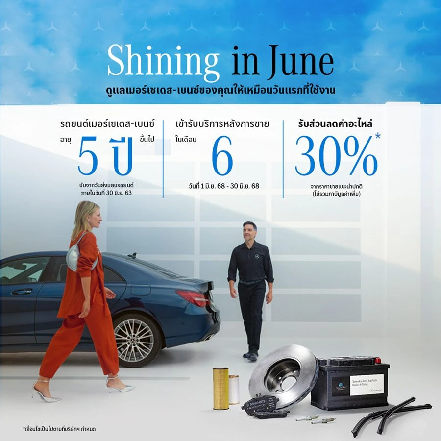 เมอร์เซเดส-เบนซ์ (ประเทศไทย) ให้ความสำคัญในการดูแลลูกค้าที่ใช้รถยนต์มากกว่า 5 ปี ให้คงสภาพการใช้งานให้เหมือนวันแรกที่ใช้งาน เพื่อตอบแทนความไว้วางใจของลูกค้าที่เข้ารับบริการอย่างต่อเนื่อง ด้วยแคมเปญ Shining in June มอบสิทธิพิเศษให้กับเจ้าของรถยนต์เมอร์เซเดส-เบนซ์ ทุกรุ่น (รวมถึงรถ Van) ที่มีอายุการใช้งานมากกว่า 5 ปี (นับจากวันส่งมอบรถยนต์ภายในวันที่ 30 มิถุนายน 2563) รับส่วนลดค่าอะไหล่ 30%* จากราคาขายแนะนำปกติ (ไม่รวมภาษีมูลค่าเพิ่ม) เมื่อนำรถเข้ารับบริการหลังการขาย ที่ศูนย์บริการเมอร์เซเดส-เบนซ์ อย่างเป็นทางการทั่วประเทศ ตั้งแต่วันที่ 1 มิถุนายน 2568 ถึง 30 มิถุนายน 2568 เพื่อมอบความมั่นใจให้กับลูกค้าคนสำคัญของเมอร์เซเดส-เบนซ์ ในทุกการเดินทาง