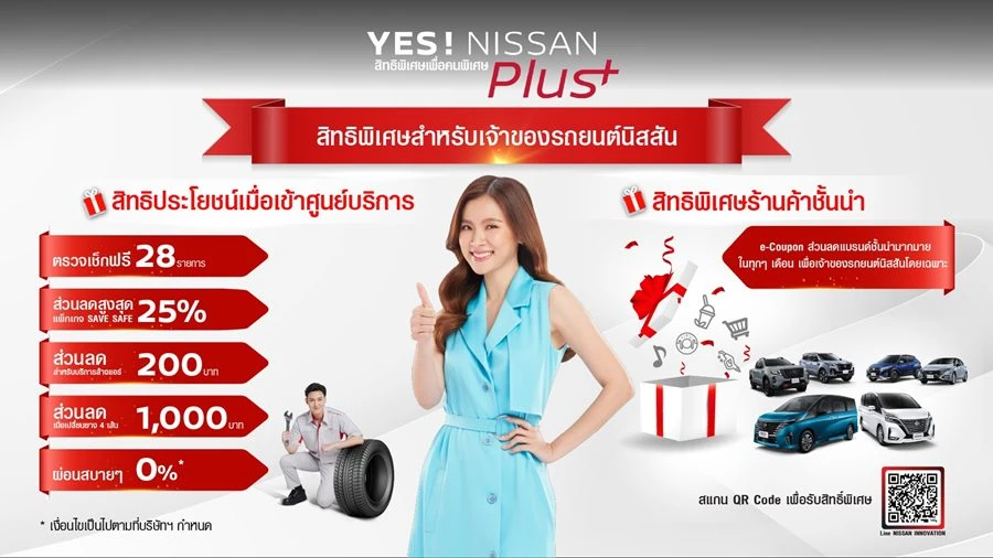 นิสสัน ประเทศไทย ยังคงมุ่งมั่นในการยกระดับประสบการณ์ของลูกค้าอย่างต่อเนื่อง ผ่านแคมเปญ YES! NISSAN Plus - สิทธิพิเศษเพื่อคนพิเศษ ด้วยโปรโมชันพิเศษจากศูนย์บริการ และแบรนด์ชั้นนำมากมาย ที่มอบความคุ้มค่าและความสะดวกสบายในทุกมิติของการใช้ชีวิต พร้อมตอบแทนความไว้วางใจของลูกค้าที่มีต่อแบรนด์มาอย่างยาวนาน