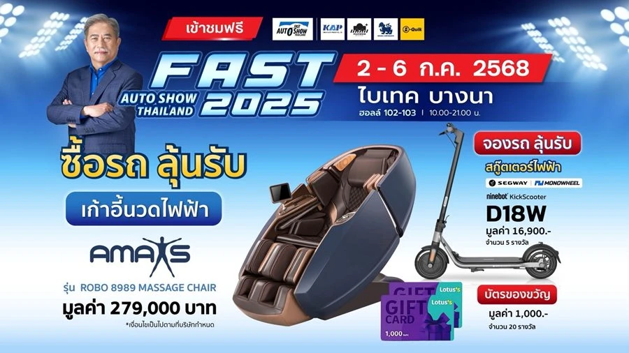 ในส่วนของกิจกรรม ซื้อรถ ลุ้นรับ ในปีนี้ ผู้จองรถและซื้อรถทุกคันในงาน ไม่เพียงได้สิทธิ์ลุ้นรับรางวัลใหญ่เป็นเก้าอี้นวดไฟฟ้ารุ่น ROBO 8989 Massage Chair จาก เอแม็กซ์ (Amaxs) แบรนด์เก้าอี้นวดไฟฟ้าและเครื่องออกกำลังกายที่ส่งเสริมสุขภาพที่ดีแบบองค์รวม ด้วยเทคโนโลยีและนวัตกรรมที่ส่งเสริมสุขภาพ มูลค่า 279,000 บาท จำนวน 1 รางวัล และของรางวัลอีกมากมายหลังจบงานเท่านั้น แต่ยังได้สิทธิ์ลุ้นรับรางวัลประจำวันเป็นสกู๊ตเตอร์ไฟฟ้า Segway รุ่น Ninebot KickScooter D18W มูลค่า 16,900 บาท จาก MONOWHEEL จำนวน 5 รางวัล หรือแค่แวะมาชมงานและร่วมสนุกกับกิจกรรม "แชร์มา รับไป" เพื่อลุ้นรับรางวัลอีกมากมาย ติดตามรายละเอียดได้ที่ Facebook: FAST AUTO SHOW ทั้งนี้ งาน “ฟาสต์ ออโต โชว์ ไทยแลนด์ 2025” ยังเป็นพื้นที่ PET Friendly สามารถนำสัตว์เลี้ยงแสนรักที่ได้รับอนุญาตตามข้อกำหนดเข้ามาชมงานได้อีกด้วย