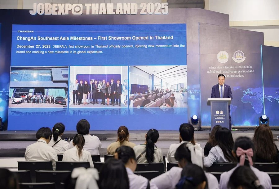 นายเซิน ซิงหัว กรรมการผู้จัดการ บริษัท ฉางอาน ออโต้ เซาท์อีส เอเชีย จำกัด และ กรรมการผู้จัดการ บริษัท ฉางอาน ออโต้ เซลส์ (ประเทศไทย) จำกัด กล่าวว่า “การเข้าร่วมในงาน JOB EXPO THAILAND 2025 ถือเป็นจิ๊กซอว์สำคัญ ภายใต้กลยุทธ์ ‘In Thailand, For Thailand’ ที่เรามุ่งมั่นลงทุนในประเทศไทย เพื่อประเทศไทย ซึ่งรวมถึงการสร้างงาน สร้างรายได้ให้คนไทยอีกด้วย โดยเราตั้งเป้าเพิ่มจำนวนพนักงานในสำนักงานออฟฟิศจาก 611 คน ในปี 2567 เป็นประมาณ 2,000 คน ภายในปี 2569 คิดเป็น 90% ของพนักงานทั้งหมด ไม่นับรวมตำแหน่งงานในสายปฏิบัติการโรงงาน ซึ่งหากนับรวมการจ้างแรงงานในโรงงานฉางอาน ออโตโมบิล ระยอง จะสร้างโอกาสการจ้างงานมากกว่า 30,000 ตำแหน่งตลอดห่วงโซ่คุณค่า นอกจากนี้ เรายังใช้ชิ้นส่วนและอะไหล่รถยนต์ท้องถิ่นมากกว่า 60% สนับสนุนการสร้างรายได้ให้กับผู้ผลิตในไทยพร้อมตั้งเป้าผลักดันประเทศไทยสู่การเป็นศูนย์กลางการผลิตรถยนต์ไฟฟ้า (EV Hub) แห่งภูมิภาคเอเชียตะวันออกเฉียงใต้อีกด้วย”