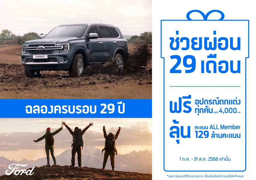 แคมเปญฉลองครบรอบ 29 ปีของฟอร์ดจะจัดขึ้นตั้งแต่วันที่ 1 กรกฎาคม ถึง 31 สิงหาคม 2568 ผู้สนใจสามารถสอบถามรายละเอียดเพิ่มเติมได้ที่โชว์รูมฟอร์ดทั่วประเทศ หรือเยี่ยมชมเว็บไซต์ www.ford.co.th