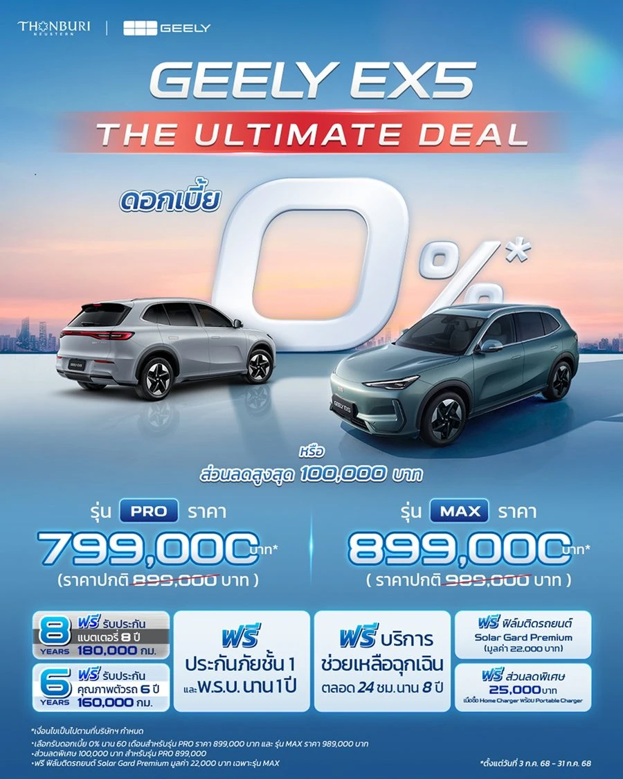 บริษัท ธนบุรีนอยสเติร์น จำกัด ผู้นำเข้าและผู้แทนจำหน่ายรถยนต์ จีลี่ (GEELY) อย่างเป็นทางการในประเทศไทย มอบข้อเสนอพิเศษแห่งปีกับแคมเปญ The Ultimate Deal สำหรับ GEELY EX5 รถอเนกประสงค์พลังงานไฟฟ้า 100% ที่มาพร้อมกับความคุ้มค่า เกินราคาในแบบที่คุณคาดไม่ถึง การันตีคุณภาพระดับโลกด้วยรางวัลชนะเลิศด้านการออกแบบจาก Red Dot Design Award 2025 พร้อมคะแนนความปลอดภัยระดับ 5 ดาว จากทั้ง Euro NCAP (European New Car Assessment Programme) และ ANCAP (Australasian New Car Assessment Program) ตอกย้ำมาตรฐานยานยนต์ระดับโลก พร้อมความมุ่งมั่นของ จีลี่ ในการพัฒนาเทคโนโลยีและการผลิตรถยนต์ที่ดีที่สุด ปลอดภัยที่สุด และทันสมัยที่สุด เพื่อส่งมอบยานยนต์คุณภาพและความคุ้มค่าสูงสุดให้แก่ลูกค้าทั่วโลก