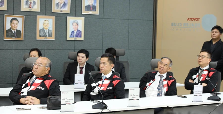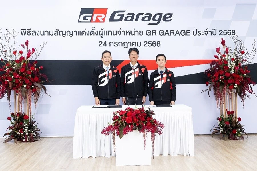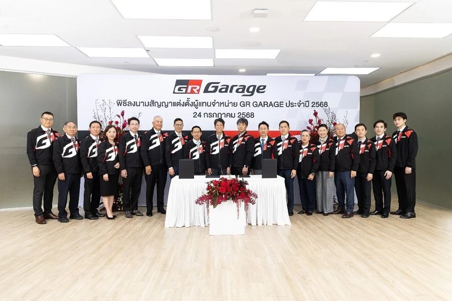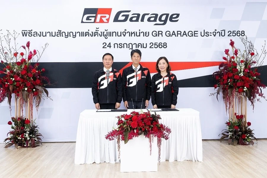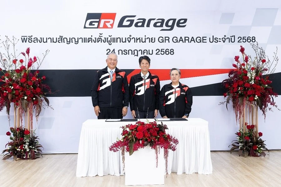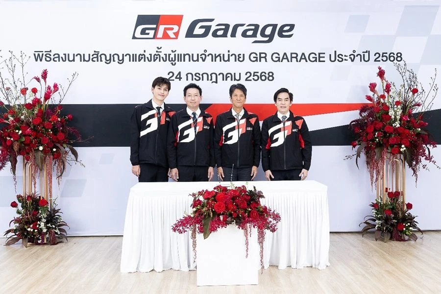 มร. โนริอากิ ยามาชิตะ กรรมการผู้จัดการใหญ่ บริษัท โตโยต้า มอเตอร์ ประเทศไทย จำกัด พร้อมด้วยตัวแทนจากผู้แทนจำหน่าย โตโยต้า ประกอบด้วย คุณพิเทพ จันทรเสรีกุล บริษัท โตโยต้า กรุงไทย จำกัด, คุณจิรเดช สมภพรุ่งโรจน์ บริษัท โตโยต้า เค.มอเตอร์ส ผู้จำหน่ายโตโยต้า จำกัด, คุณสุชาวดี ประโยชน์อมร ภาณุประภา พร้อมด้วย คุณคาร์ล ออพเพนบอร์น บริษัท โตโยต้า ธนบุรี จำกัด, คุณเรืองชัย จิตรสกุล บริษัท โตโยต้าริช จำกัด, คุณกมลพงศ์ สงวนตระกูล บริษัท โตโยต้าขอนแก่น ผู้จำหน่ายโตโยต้า จำกัด และ คุณชัยภัทร ณ ระนอง บริษัท โตโยต้าเพิร์ล ผู้จำหน่าย โตโยต้า จำกัด ร่วมเป็นเกียรติในพิธีลงนามสัญญาแต่งตั้งผู้แทนจำหน่าย GR GARAGE ประจำปี 2568 เมื่อวันที่ 24 กรกฎาคม 2568 ณ TOYOTA ALIVE ถนนบางนา-ตราด กม.3