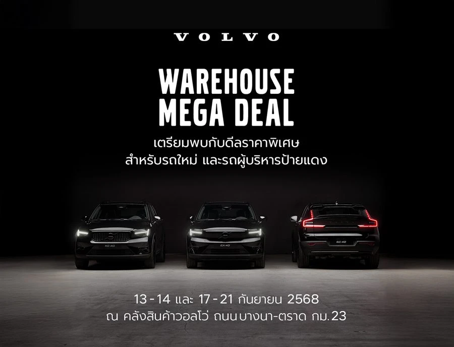 ครั้งแรกจาก วอลโว่ คาร์ ประเทศไทย กับงาน Volvo Warehouse Mega Deal งานที่เปิดโอกาสให้ผู้สนใจสามารถเลือกซื้อรถใหม่วอลโว่ทุกรุ่น ไม่ว่าจะเป็นรถไฟฟ้า 100% อาทิ Volvo EX90, Volvo EX40, Volvo EC40 และ Volvo EX30 หรือรถปลั๊กอินไฮบริด รุ่น Volvo XC90 โฉมใหม่, Volvo XC90, Volvo XC60 และ Volvo S90 หรือรถผู้บริหาร รถป้ายแดงไมล์น้อย (Volvo Selekt) ถึงคลังสินค้า โดยไม่เพียงลูกค้าสามารถเลือกรุ่นรถ สเปค หรือสีที่ต้องการ แต่ยังสามารถเลือกแคมเปญส่งเสริมการขายที่ปรับได้ดั่งใจบนสิทธิประโยชน์มูลค่า 200,000 – 1,000,000 บาท (แล้วแต่รุ่น) และข้อเสนอเพิ่มเติมในงานซึ่งจะจัดขึ้น ระหว่างวันที่ 13 - 14 และ 17 - 21 กันยายน พ.ศ. 2568 ตั้งแต่เวลา 10.00 - 18.00 น. ณ คลังสินค้าวอลโว่ ถนนบางนา-ตราด กม. 23