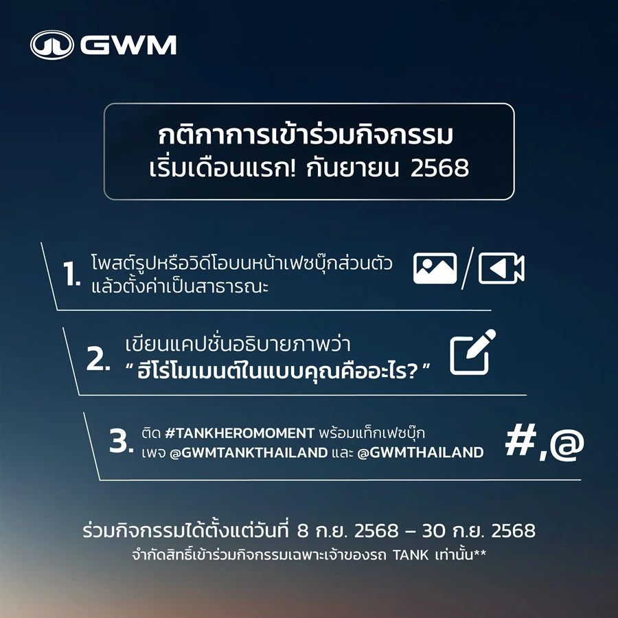 - ประกาศผลประจำเดือนกันยายนในวันที่ 6 ตุลาคม 2568 เวลา 18.00น. ทาง Facebook Page: GWM TANK THAILAND