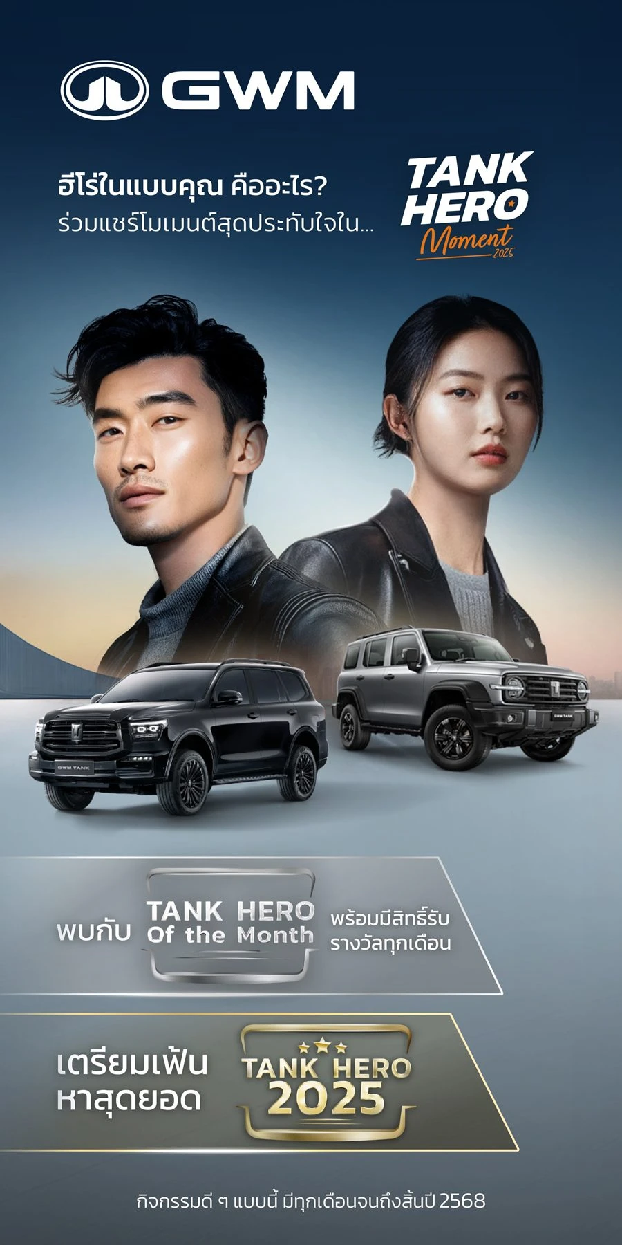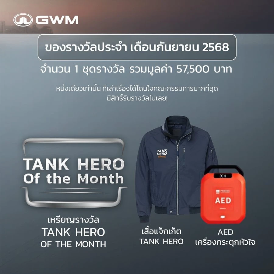 GWM (Thailand) มุ่งมั่นในการพัฒนาเทคโนโลยียานยนต์ที่ตอบโจทย์ผู้ใช้งานทั่วทุกมุมโลก โดยยกระดับสู่การเป็นแบรนด์รถยนต์ที่มีผลิตภัณฑ์ครอบคลุมทุกประเภทพลังงาน ด้วยแนวคิด “ครอบคลุมทุกการใช้งาน (All Scenarios) ด้วยผลิตภัณฑ์ที่ครอบคลุมทุกพลังงาน (All Powertrains) สู่การตอบสนองทุกกลุ่มผู้ใช้งานอย่างแท้จริง (All Users)” นอกจากความมุ่งมั่นส่งมอบยานยนต์ที่ไม่เพียงตอบโจทย์ทุกเส้นทางแล้ว แต่รถยนต์ทุกรุ่น ทุกขุมพลังของ GWM ยังเป็นเพื่อนคู่ใจของผู้ขับขี่ที่พร้อมออกผจญภัยไปกับชีวิตจริง และครั้งนี้ GWM ได้ต่อยอดพลังของคอมมูนิตี้ “TANKER CLUB” ให้ก้าวไปอีกระดับ ด้วยการเปิดพื้นที่ให้ผู้ใช้ TANK ทุกรุ่น ได้แบ่งปันความเป็น ‘ฮีโร่’ ที่มีอยู่ในตัวเอง ภายใต้แคมเปญล่าสุด “TANK HERO MOMENT” ครั้งแรกในประเทศไทย! ชวน TANKER จากทั่วทุกมุมของประเทศร่วมถ่ายทอดช่วงเวลาแห่งความกล้าหาญ ท้าทาย ความมีน้ำใจ และแรงบันดาลใจ ผ่านภาพถ่ายหรือรูปแบบวิดีโอภายใต้เรื่องจริง เพื่อร่วมสร้างพลังบวกให้กับคอมมูนิตี้ TANKER และสังคมไทย พร้อมลุ้นเป็น TANK HERO of THE MONTH และ TANK HERO of THE YEAR รับรางวัลจากการสร้างสรรค์สิ่งดี ๆ ในทุกเดือนและปี ตั้งแต่ 1 กันยายน 2568 ถึง 31 ธันวาคม 2568