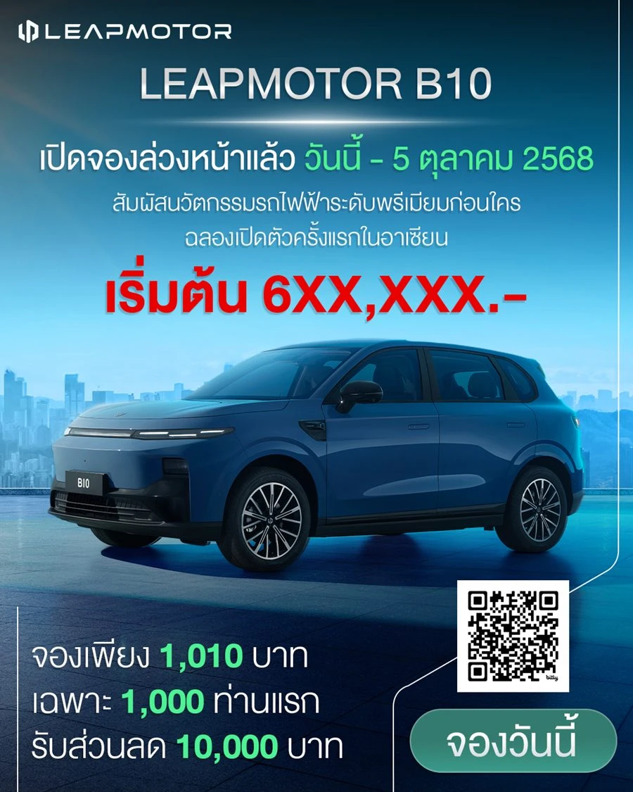Leapmotor Thailand เปิดจองสิทธิ์ให้คุณเป็นเจ้าของรถยนต์พลังงานไฟฟ้า Leapmotor B10 รุ่นใหม่ล่าสุดที่จะเข้ามาทำตลาดรถ EV ในประเทศไทยและเป็นครั้งแรกในอาเซียน สำหรับท่านลูกค้าที่สนใจสามารถจองสิทธิ์เป็นเจ้าของ Leapmotor B10 ได้แล้ววันนี้! เพียง 1,010 บาท จำกัดเพียง 1,000 สิทธิ์เท่านั้น พร้อมรับส่วนลดอีก 10,000 บาท ตั้งแต่วันนี้จนถึงวันที่ 5 ตุลาคมนี้ ออกรถภายในวันที่ 31 ตุลาคม 2568