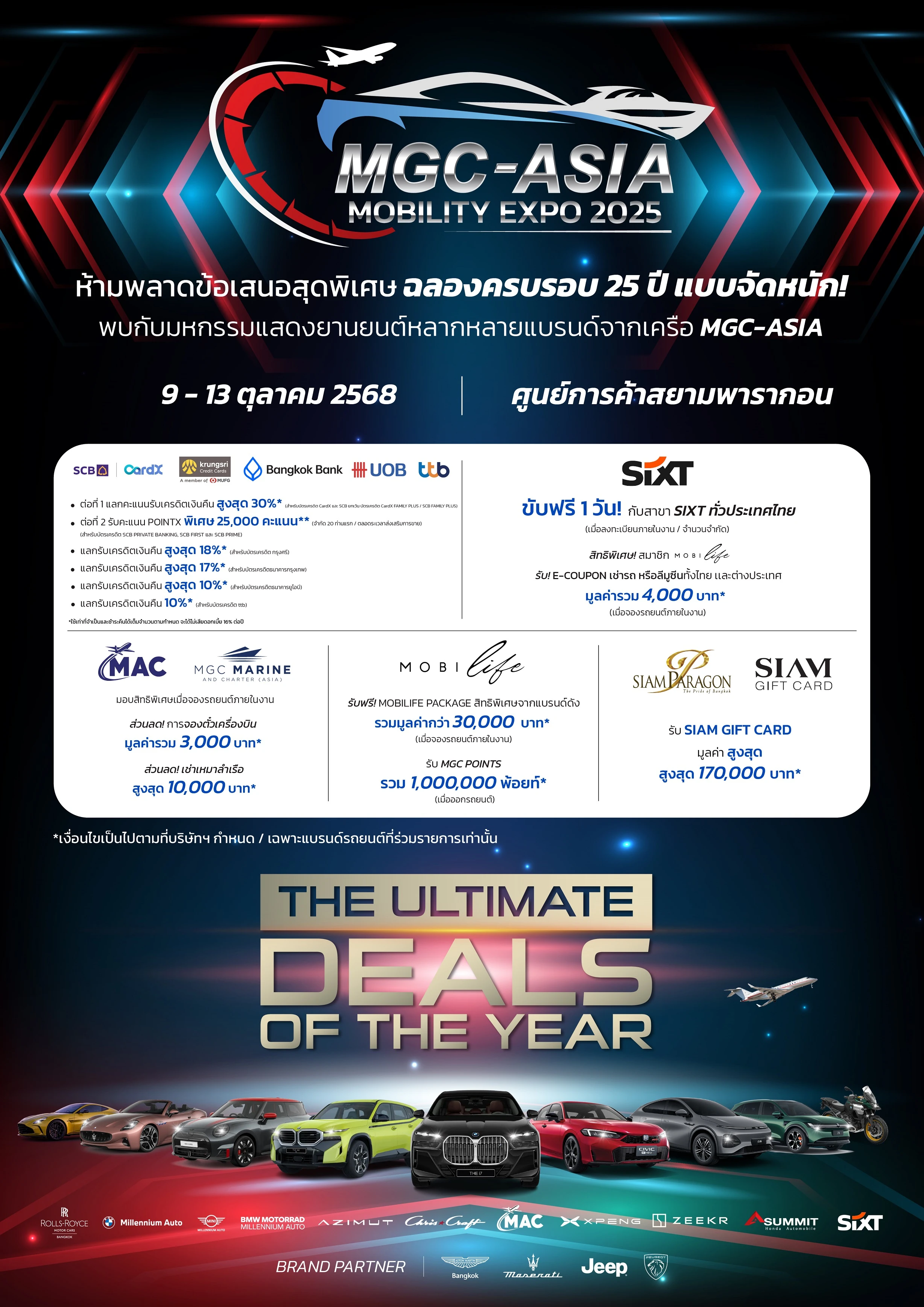 บริษัท มิลเลนเนียม กรุ๊ป คอร์ปอเรชั่น (เอเชีย) จำกัด (มหาชน) หรือ MGC-ASIA ผู้นำธุรกิจไลฟ์สไตล์โมบิลิตี้ครบวงจร จัดงานใหญ่ประจำปี MGC-ASIA MOBILITY EXPO 2025 ยกทัพยนตรกรรมในเครือ ครบทุกแบรนด์ จัดแสดงให้ลูกค้าได้สัมผัสอย่างใกล้ชิด พร้อม The Ultimate Deals of the Year ข้อเสนอพิเศษแห่งปีที่ยากจะปฏิเสธ ระหว่างวันที่ 9-13 ตุลาคม 2568 ที่ศูนย์การค้าสยามพารากอน