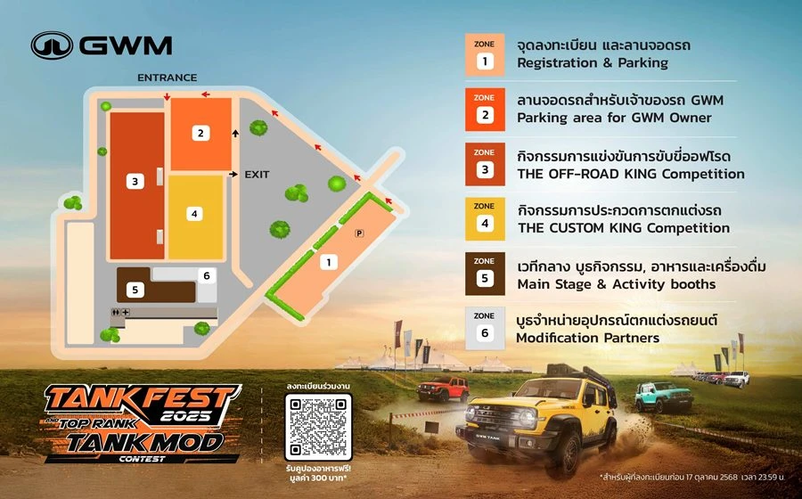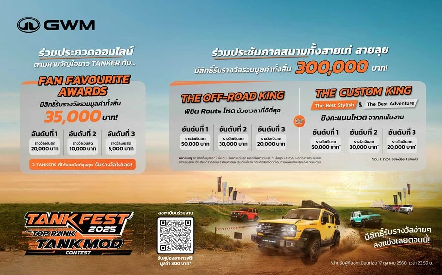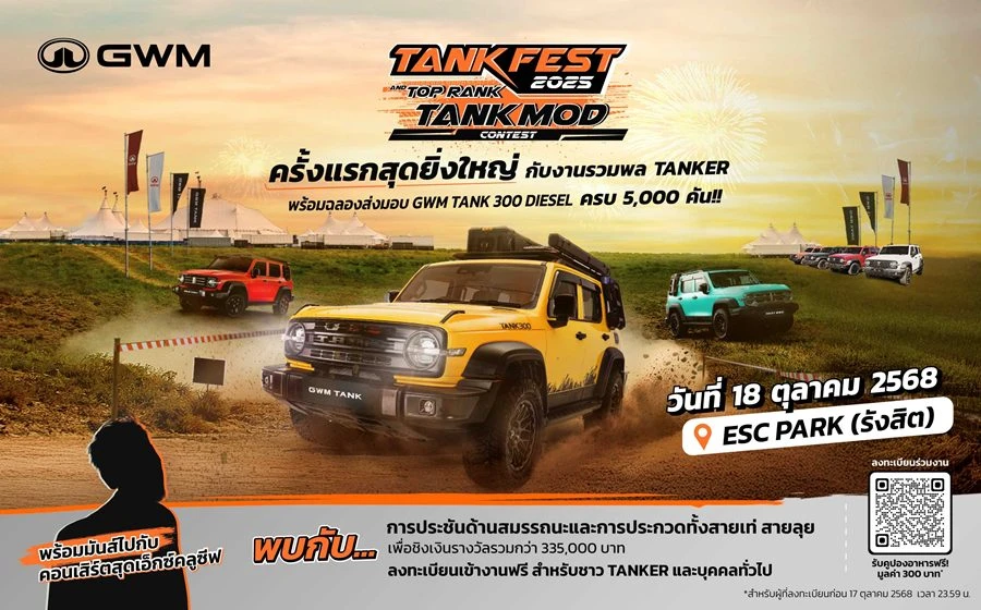GWM จึงจัดมหกรรมเฟสติวัลสุดยิ่งใหญ่ TANK FEST 2025 and TOP RANK TANK MOD ครั้งแรกในไทย เนรมิตพื้นที่ขนาดมหึมาเกือบ 50,000 ตารางเมตร ให้เป็นลานกิจกรรมสุดเร้าใจ เปิดพื้นที่สำหรับแฟนพันธุ์แท้ GWM TANK ทั้งสายออฟโรดและสายชิลล์ผู้ที่ชื่นชอบการแต่งรถให้เป็นพื้นที่ได้ปล่อยของ ปลดปล่อยจินตนาการ และความคิดสร้างสรรค์ได้อย่างไร้ขีดจำกัด ผ่านกิจกรรมความสนุกที่อัดแน่นในทุกตารางนิ้ว ทั้งเวทีประกวดและจัดแสดงรถแต่ง การแข่งขันการขับขี่ออฟโรดสุดครีเอทีฟ สนามเทสต์สมรรถนะ GWM TANK กิจกรรมความสนุกอีกมากมาย พร้อมรับของที่ระลึกติดไม้ติดมือกลับบ้าน การันตีความอร่อยตลอดวันด้วยสตรีทฟู้ดกับ Food truck เจ้าดังจำนวนมาก รับชมการแสดงดนตรีคลอเคล้าบรรยากาศจากวงดนตรีชื่อดังตั้งแต่เช้าจรดเย็น พร้อมตบท้ายด้วยคอนเสิร์ตจากศิลปินชื่อดังยามค่ำคืน สำหรับผู้ที่สนใจทุกคนเข้าร่วมงานฟรีแบบไม่มีค่าใช้จ่าย จะมาคนเดียว มาเป็นคู่ เป็นแก๊งค์ หรือยกขบวนทั้งครอบครัว ปักหมุดแล้วมาเจอกัน วันเสาร์ที่ 18 ตุลาคม 2568 ณ ESC Park รังสิต จ.ปทุมธานี และวันอาทิตย์ที่ 19 ตุลาคม 2568 สำหรับผู้ที่สนใจทดลองขับ GWM