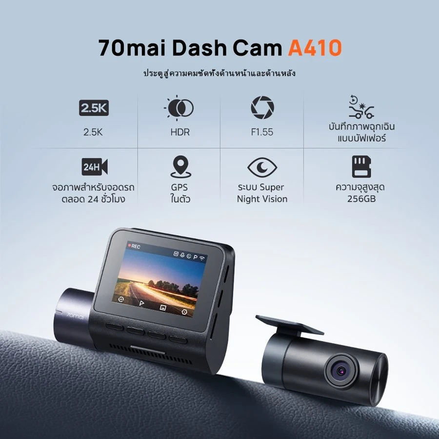 มั่นใจทั้งเรื่องความปลอดภัยและความคมชัด ด้วยกล้องติดรถยนต์ 70mai Dash Cam A410 ที่สามารถบันทึกภาพด้านหน้าแบบ 2.5K และด้านหลังแบบ 1080P พร้อมระบบ HDR ระดับฮาร์ดแวร์ พร้อมการติดตั้งที่ง่ายดาย ทำให้สามารถบันทึกทุกช่วงการเดินทางได้อย่างละเอียด ไม่ว่าจะเป็นการขับขี่ในชีวิตประจำวันหรือการเดินทางไกล ก็อุ่นใจได้ตลอดเส้นทาง