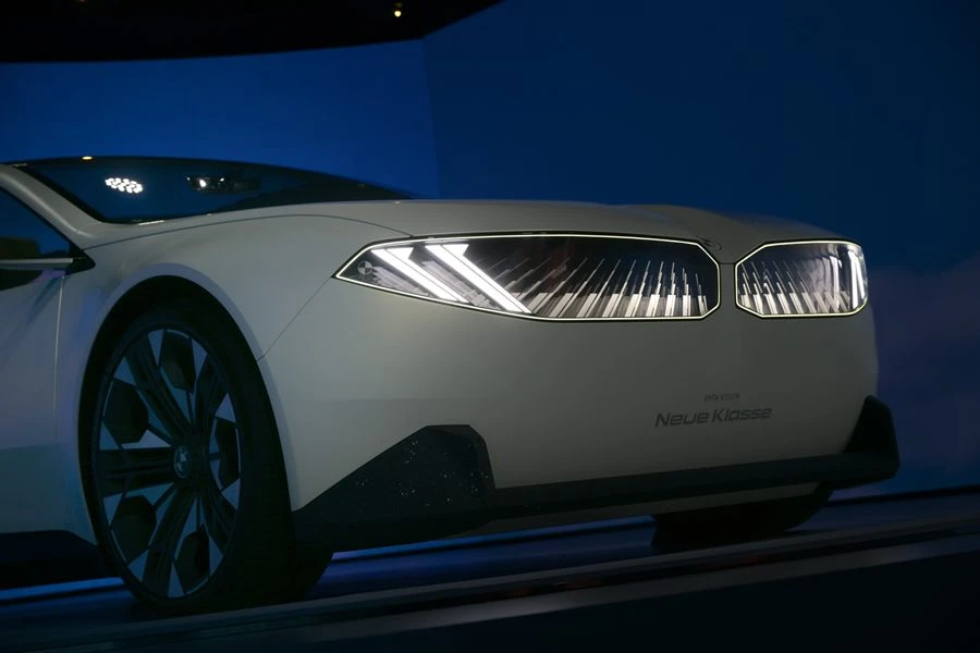 ด้านหน้าของ Vision Neue Klasse สดใหม่ด้วยการนำเอกลักษณ์ของบีเอ็มดับเบิลยูอย่างกระจังหน้าทรงไตคู่ มาตีความด้วยมุมมองที่แตกต่าง โดยกระจังหน้าดีไซน์ใหม่ถูกหลอมรวมเป็นชิ้นเดียวกับไฟหน้า ซึ่งประกอบไปด้วยไฟดวงเล็กจำนวนมาก โดยแต่ละดวงสามารถตั้งค่าการส่องสว่างได้แยกจากกัน ติดตั้งอยู่ใต้ผิวหน้าที่เป็นกระจกให้เกิดเป็นดีไซน์ที่จับทุกสายตาด้วยความลึกจากชิ้นส่วนที่เล่นระดับ ส่วนไฟส่องสว่างในเวลากลางวัน (Daytime Running Lights) มาในรูปแถบไฟเฉียงบริเวณด้านข้าง ทำมุมตัดกับชุดไฟหน้าหลัก แนวคิดการออกแบบชุดไฟหน้านี้ยังถูกนำไปปรับใช้กับไฟท้าย ซึ่งประกอบขึ้นจากชิ้นส่วนที่ผลิตจากการพิมพ์แบบสามมิติ เพื่อสร้างรูปลักษณ์ที่มีมิติและความลึกในลักษณะเดียวกัน