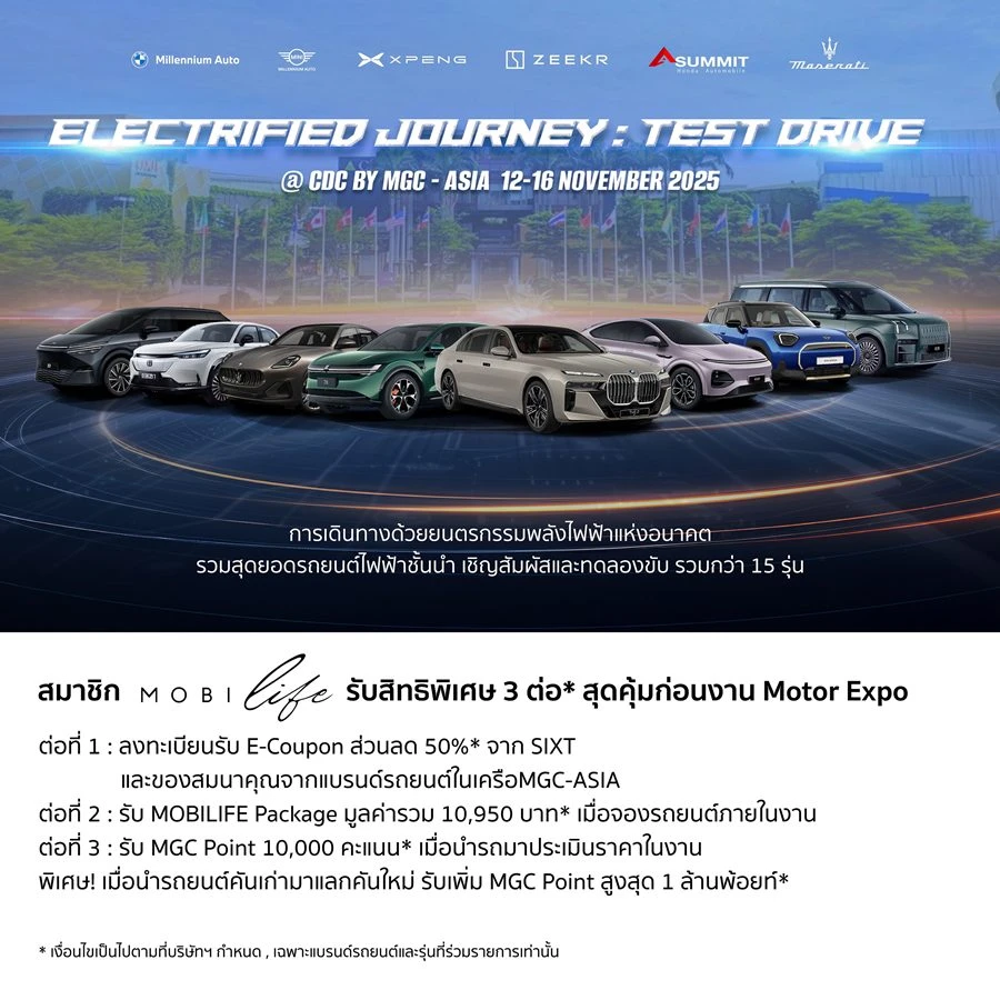 บริษัท มิลเลนเนียม กรุ๊ป คอร์ปอเรชั่น (เอเชีย) จำกัด (มหาชน) หรือ MGC-ASIA ผู้นำธุรกิจไลฟ์สไตล์โมบิลิตี้ครบวงจร จัดกิจกรรมเพื่อผู้ชื่นชอบรถยนต์ไฟฟ้าโดยเฉพาะ กับงาน Electrified Journey by MGC-ASIA ยกทัพยนตรกรรมไฟฟ้าระดับพรีเมียมลักชัวรี่ในเครือฯ และแบรนด์พันธมิตร รวม 7 แบรนด์ มากกว่า 15 รุ่น มาจัดแสดง พร้อมเปิดโอกาสให้สัมผัสและทดลองขับในสนามเฉพาะกิจ มาพร้อมข้อเสนอสุดพิเศษทุกรุ่น ระหว่างวันที่ 12-16 พฤศจิกายน 2568 ที่ คริสตัล ดีไซน์ เซ็นเตอร์ (CDC) เลียบทางด่วนเอกมัย-รามอินทรา