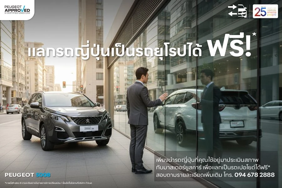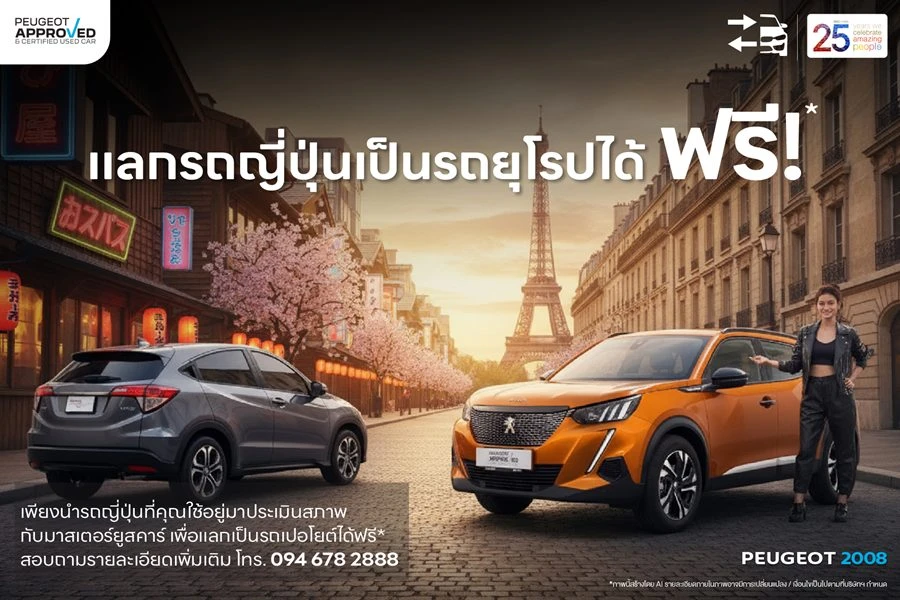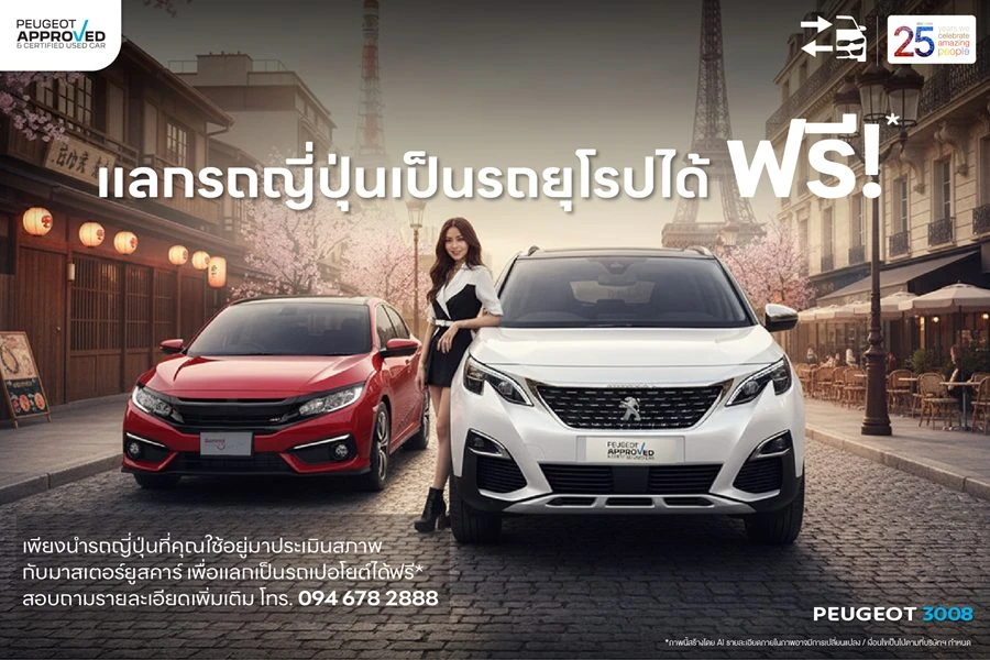 PEUGEOT APPROVED & CERTIFIED USED CAR รูปลักษณ์สไตล์ฝรั่งเศส โดดเด่นและไม่ซ้ำใครการันตีคุณภาพด้วยการตรวจสอบอย่างละเอียด 258 รายการ จากผู้เชี่ยวชาญของเปอโยต์ ประเทศไทย อุ่นใจเต็มที่ด้วยการรับประกันคุณภาพสูงสุดถึง 2 ปี หรือ 60,000 กิโลเมตร พร้อมบริการช่วยเหลือฉุกเฉิน 24 ชั่วโมง นับเป็นโอกาสครั้งสำคัญที่จะยกระดับการเดินทางของคุณสู่มาตรฐานยุโรปแบบฟรี ๆ วันนี้ ถึง 30 พฤศจิกายน 2568 (จำนวนจำกัด!)