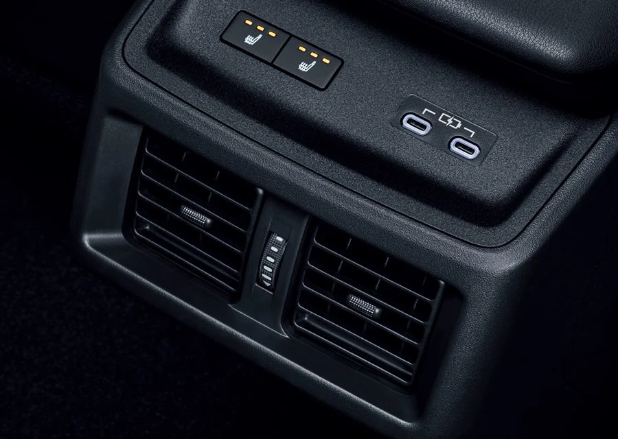 - ช่องปรับอากาศตอนหลัง พร้อมพัดลมจากใต้เบาะและพนักพิง และเชื่อมต่ออุปกรณ์ไฟฟ้า Fast Charge USB Type-C (60W) 2 ตำแหน่ง สำหรับผู้โดยสารตอนหลัง