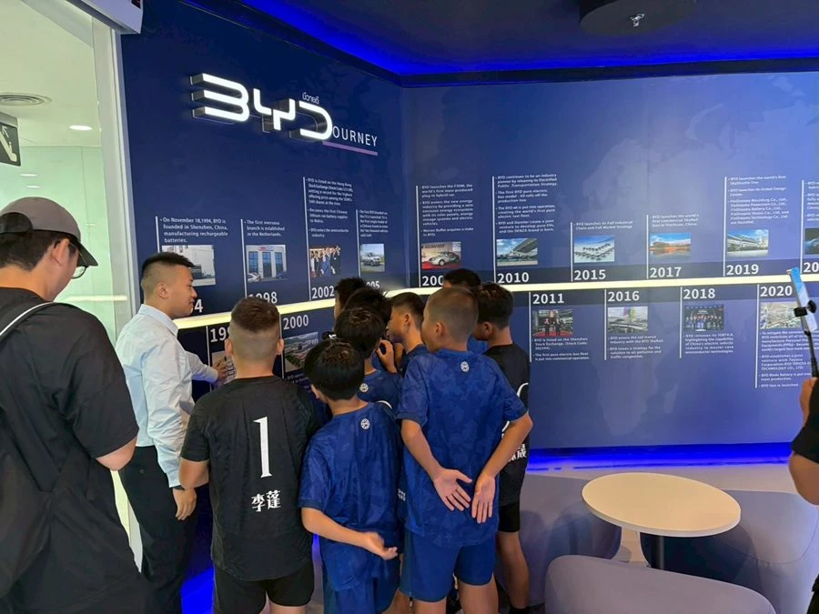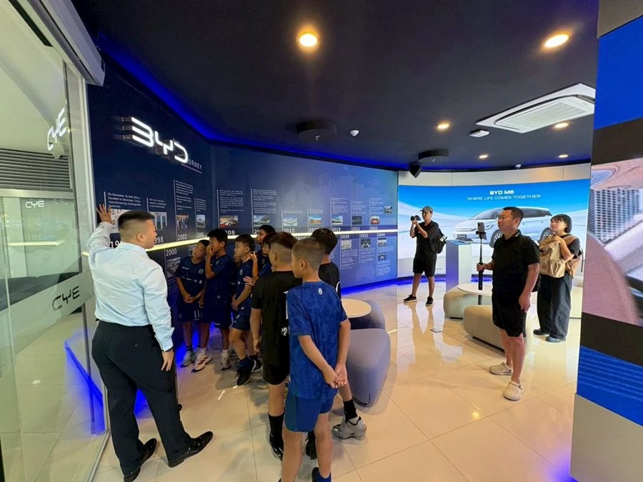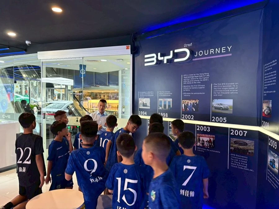 บริษัท บีวายดี ออโต้ (ประเทศไทย) จำกัด และ บริษัท เรเว่ ออโตโมทีฟ จำกัด ผู้จัดจําหน่ายและให้บริการหลังการขายรถยนต์พลังงานใหม่ บีวายดี และ เดนซ่า อย่างเป็นทางการในประเทศไทย ภายใต้กลุ่มธุรกิจเรเว่ ผู้สนับสนุนหลักอย่างเป็นทางการของฟุตบอลทีมชาติไทย ขยายขอบเขตการร่วมขับเคลื่อนวงการกีฬาไทยสู่ระดับนานาชาติ ผ่านการนำทีมฟุตบอลเยาวชนจากประเทศจีน XiaoJiang U10 เยี่ยมชมศูนย์ BYD Experience Store เพื่อเปิดประสบการณ์การเรียนรู้นวัตกรรมล่าสุด ของยานยนต์พลังงานใหม่ ที่ให้ทั้งความรู้และความเพลิดเพลินแก่ผู้เยี่ยมชม ไปพร้อมกับปลูกฝังแนวคิดเพื่อความยั่งยืน