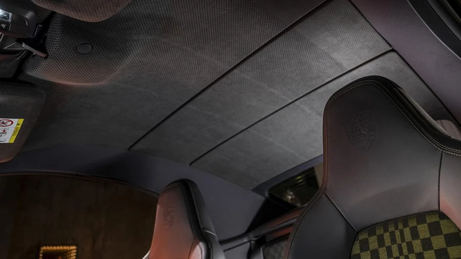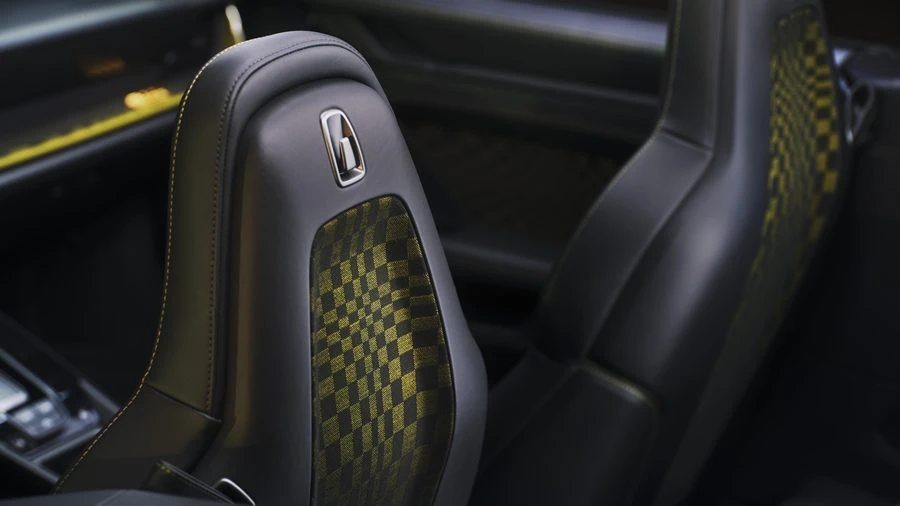 การตกแต่งภายในโดดเด่นด้วยลาย Pasha สีดำตัดกับสีเขียว ลายที่ได้รับแรงบันดาลใจจากธงตราหมากรุกที่กำลังโบกสะบัด ด้วยการจัดวางสี่เหลี่ยมหลายขนาดเพื่อสร้างมิติของการเคลื่อนไหว เพื่อให้ความรู้สึกถึงรถแข่งในยุค 70 และหนัง Club Leather สี Basalt Black พร้อมเดินตะเข็บด้ายสี Olive Neo รวมถึงแพ็กเกจตกแต่งภายใน Basalt Black Club Leather ที่เป็นมาตรฐาน