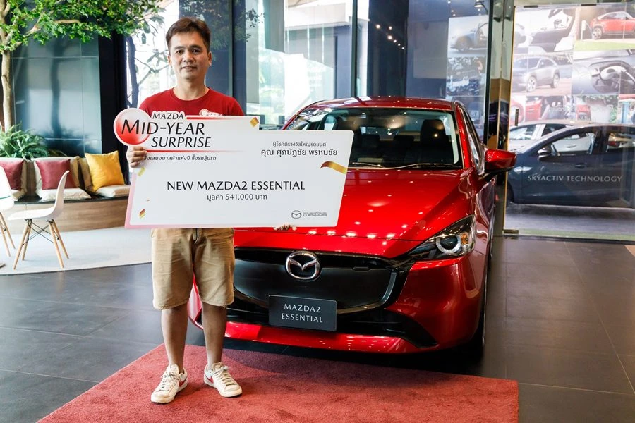 สำหรับแคมเปญ MAZDA MID-YEAR SURPRISE ข้อเสนอมาสด้าแห่งปี ซื้อรถลุ้นรถ เป็นแคมเปญที่มาสด้าจัดขึ้นเพื่อลูกค้าที่ซื้อรถยนต์มาสด้าคันใหม่ในระหว่างเดือนสิงหาคมและกันยายน 2568 ได้มีโอกาสลุ้นรับโชคถึง 2 ต่อ รวมมูลค่ากว่า 1.8 ล้านบาท ทั้งรางวัลประจำเดือน 260 รางวัล ประกอบด้วย  Apple iPhone 16e 128GB มูลค่า 20,000 บาท* จำนวน 20 รางวัล, Apple iPad A16 11-inch Wi-Fi 128GB มูลค่า 11,100 บาท* จำนวน 40 รางวัล, เครื่องฟอกอากาศในรถยนต์ SHARP รุ่น IG-NX2B มูลค่า 2,247 บาท* จำนวน 200 รางวัล และรางวัลใหญ่ รถยนต์ New Mazda2 Essential รุ่น 1.3 Prime มูลค่า 541,000 บาท อีก 1 รางวัล ทั้งนี้ มาสด้าได้ประกาศรายชื่อผู้โชคดีและมอบรางวัลให้กับลูกค้าทั้งหมดเป็นที่เรียบร้อยแล้ว