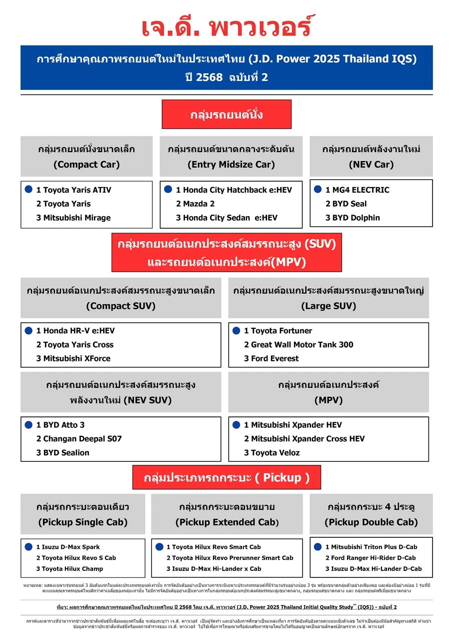 เจ.ดี.พาวเวอร์ เผยผล การศึกษาคุณภาพรถยนต์ใหม่ในประเทศไทย ประจำปี 2568 (J.D. Power 2025 Thailand Initial Quality StudySM (IQS)) ใน กลุ่มเจ้าของรถใหม่จำนวน 4,832 ราย ซึ่งซื้อรถระหว่างเดือนมกราคมถึงกันยายน 2568 โดยทำการสำรวจภาคสนามระหว่างเดือนมิถุนายนถึงตุลาคม 2568 ใน 22 เมืองใหญ่ทั่วประเทศไทย ครอบคลุมรถยนต์ 57 รุ่นจาก 15 แบรนด์ โดยจัดอันดับจากจำนวนปัญหาต่อรถยนต์ 100 คัน (PP100) ซึ่งคะแนนปัญหาน้อยแสดงถึงคุณภาพที่ดีกว่า