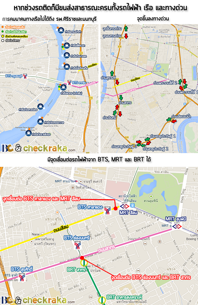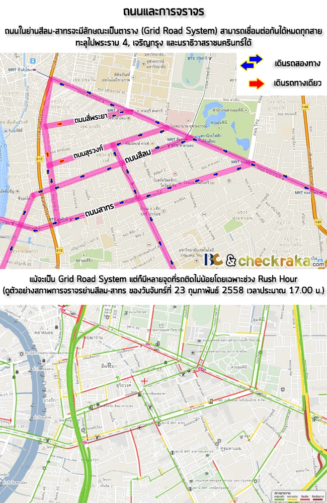 ปัจจัยด้านการเดินทางเข้า-ออก - จุดเด่นของการเดินทางเข้าออกทำเลนี้มี 2 ประเด็นค่ะคือ (ก) ถนนบริเวณนี้เป็น Grid Road System สามารถเชื่อมต่อทะลุไปมากับถนนหลักหลายเส้นในละแวกนี้ได้หมดคือ ถนนพระราม 4, นราธิวาสราชนครินทร์, เจริญกรุง, สุรศักดิ์ สุรวงศ์ และสี่พระยา ประกอบกับมีทางด่วนในหลายๆ ด่านทั้งขาขึ้นและขาลง และ (ข) มีขนส่งสาธารณะครบถ้วนทั้ง BTS, MRT, BRT และทางเรือ ในขณะที่ข้อด้อยก็คือ เนื่องจากบริเวณนี้มีสำนักงานออฟฟิศ และโรงเรียนเยอะ ช่วง Rush Hours การจราจรจึงค่อนข้างติดหนักทีเดียวโดยเฉพาะถนนสาทรใต้ (ในช่วงเช้า) สุรศักดิ์ (ในช่วงเย็น) และสี่แยกสาทร-นราธิวาสราชนครินทร์ (เกือบตลอดทั้งวัน!) เป็นต้น