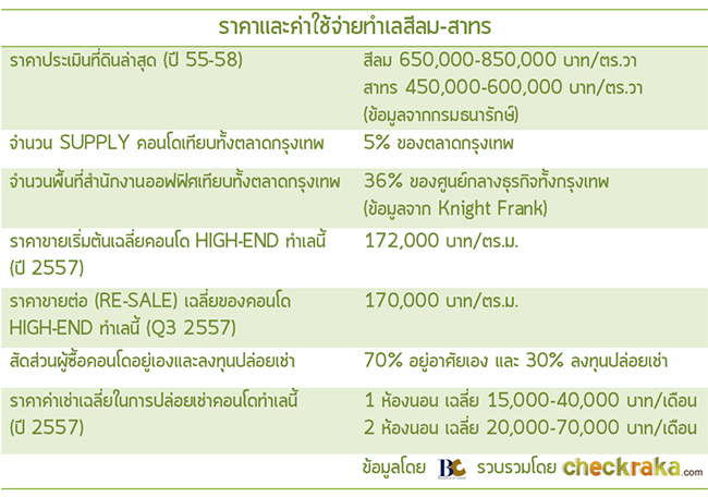 ย่านสีลม-สาทรนี้เป็นใจกลางธุรกิจของกรุงเทพ แน่นอนว่าราคาคอนโดแถบนี้จึงสูงเป็นปกติ แต่เนื่องจากผู้ที่ต้องการซื้อคอนโดในย่านนี้มีทุนอยู่แล้ว จึงทำให้ทำเลนี้มีสัดส่วนของการซื้อเพื่ออยู่อาศัยสูงถึง 70% และซื้อเพื่อลงทุน 30% (ข้อมูลจาก bkkcitismart) ซึ่งการซื้อเพื่ออยู่เองนั้นส่วนใหญ่จะเป็นคนในพื้นที่เดิมที่ย้ายจากอาคารพาณิชย์ ขยับขยายมาซื้อคอนโดในละแวกเดียวกันเพื่อที่จะสามารถไป-มาบ้านเดิมได้ ส่วนอีก 30% นั้นจะเป็นการลงทุนเพื่อปล่อยเช่าให้กับชาวต่างชาติและคนที่ทำงานในย่านสีลม-สาทร เพื่อให้เข้าใจง่ายขึ้นทาง Checkraka ได้รวบรวมข้อมูลสถิติเกี่ยวกับราคา Supply และค่าเช่าคอนโดในทำเลนี้มาให้ชมกันเป็นตัวอย่างในตารางข้างล่างนี้ค่ะ
