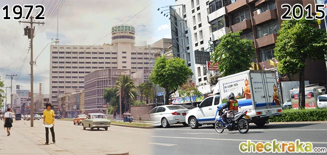 ภาพเปรียบเทียบบริเวณโรงแรมนารายณ์ ถนนสีลมเมื่อปี ค.ศ. 1972 กับปัจจุบัน