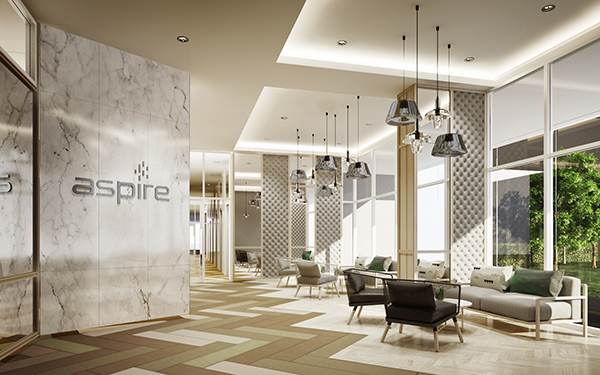 ภาพตัวอย่างบริเวณล็อบบี้ที่ผสมผสานระหว่างลายไม้ หินอ่อน และเพิ่มความหรูหราด้วยการบุผนังด้วยผ้า