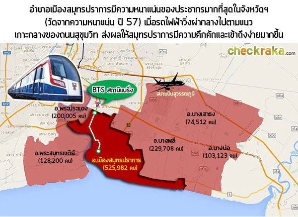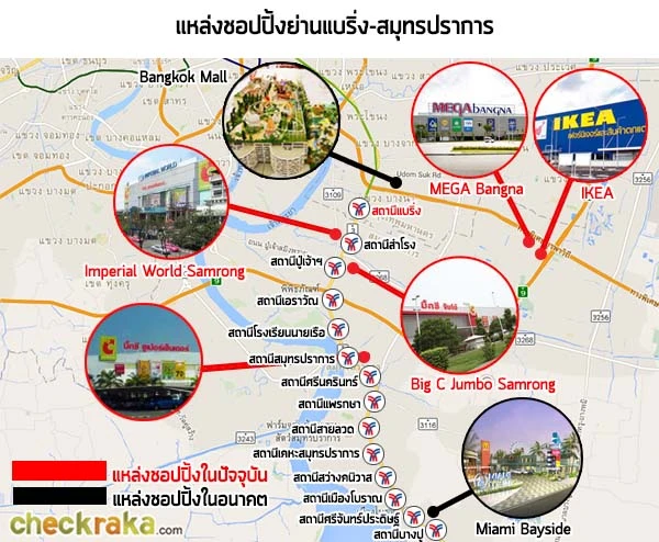 เมื่อรถไฟฟ้าส่วนต่อขยายเริ่มเป็นรูปเป็นร่างมากขึ้น ก็เริ่มมีผู้อยู่อาศัยในบริเวณตั้งแต่แบริ่งจนถึงพิพิธภัณฑ์ช้างเอราวัณเพิ่มมากขึ้นเรื่อยๆ เราเข้าใจว่าศูนย์การค้า และคอมมูนิตี้มอลล์หลายรายก็เริ่มจับตามอง และหาที่ดินในทำเลนี้กันมากขึ้น เพราะจำนวนประชากรในบริเวณนี้ถือว่าสูงที่สุดบริเวณหนึ่งในจังหวัดสมุทรปราการ (ดูตัวเลขประชากรในรูปด้านล่าง) ทำให้ทำเลนี้มีโอกาสสูงที่จะพัฒนาเหมือนย่านอ่อนนุช ซึ่งเต็มไปด้วยตลาดสด ร้านค้า ร้านอาหารริมทาง และร้านค้าปลีกทั้งเล็กและใหญ่ผสมปนเปกันไป สำหรับโครงการไลฟ์สไตล์มอลล์ล่าสุดที่ไปเปิดตัวในจังหวัดสมุทรปราการคือ "Miami Bayside Night Bazaar" ของกลุ่มบริษัท เจ.เอส.พี พร็อพเพอร์ตี้ ซึ่งจะเปิดตัวในปี 2559 ใกล้กับเมืองโบราณ โดยในระหว่างนั้น ต้นปี 2559 โครงการ Mixed Use ชื่อ "The Bangkok Mall" ของกลุ่ม The Mall Group ก็จะเปิดตัวบนพื้นที่กว่า 100 ไร่ใกล้สี่แยกบางนา โดยโครงการนี้จะมีพื้นที่ใหญ่กว่า Siam Paragon ถึง 3 เท่าตัวกันเลยทีเดียวค่ะ